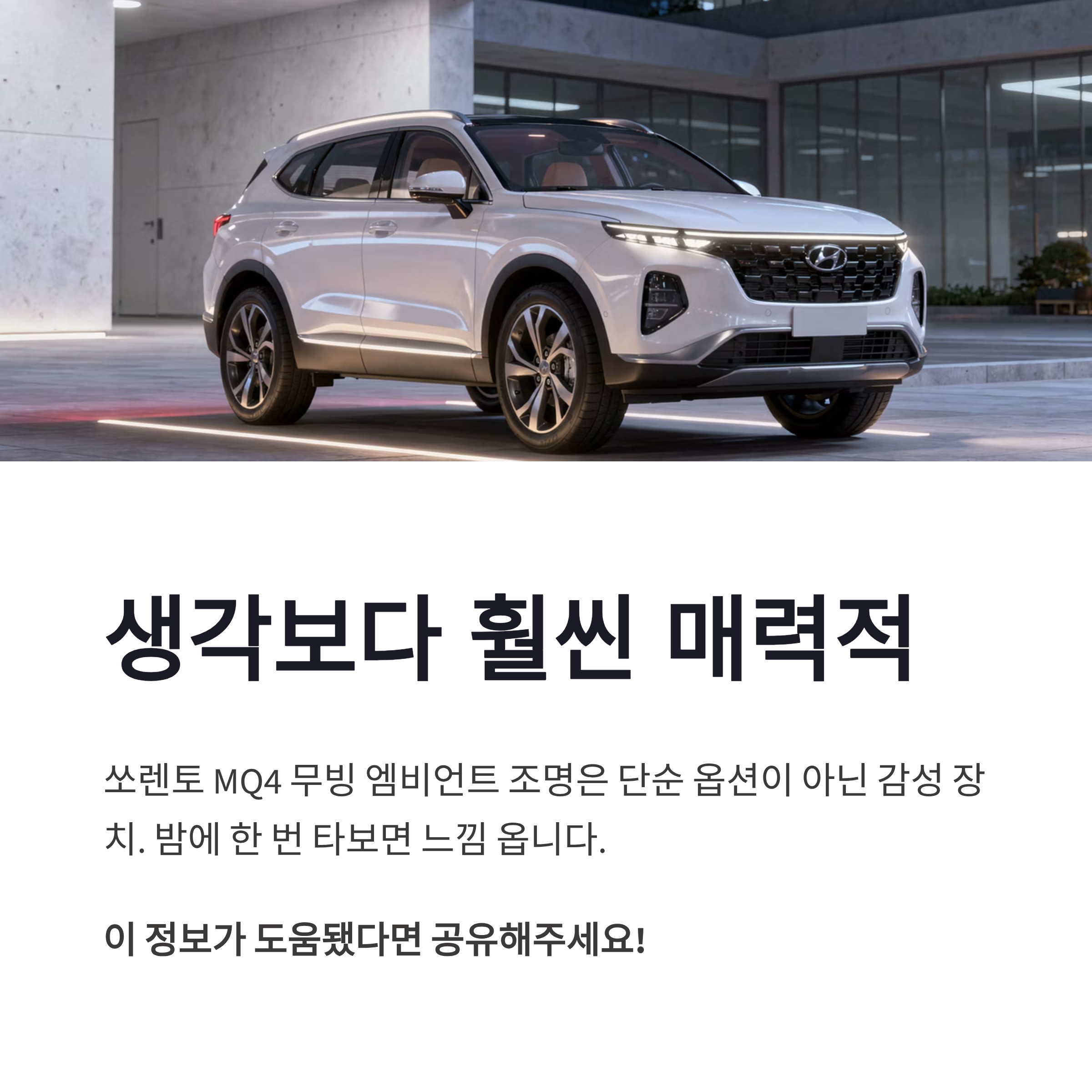 #쏘렌토MQ4 #쏘렌토페이스리프트 #무빙엠비언트조명 #쏘렌토실내조명 #SUV실내감성 #기아쏘렌토 #64색엠비언트 #2026쏘렌토 #중형SUV추천 #자동차실내튜닝 #야간드라이브감성 #차량무드등 #자동차옵션추천 #쏘렌토실내인테리어 #신형쏘렌토