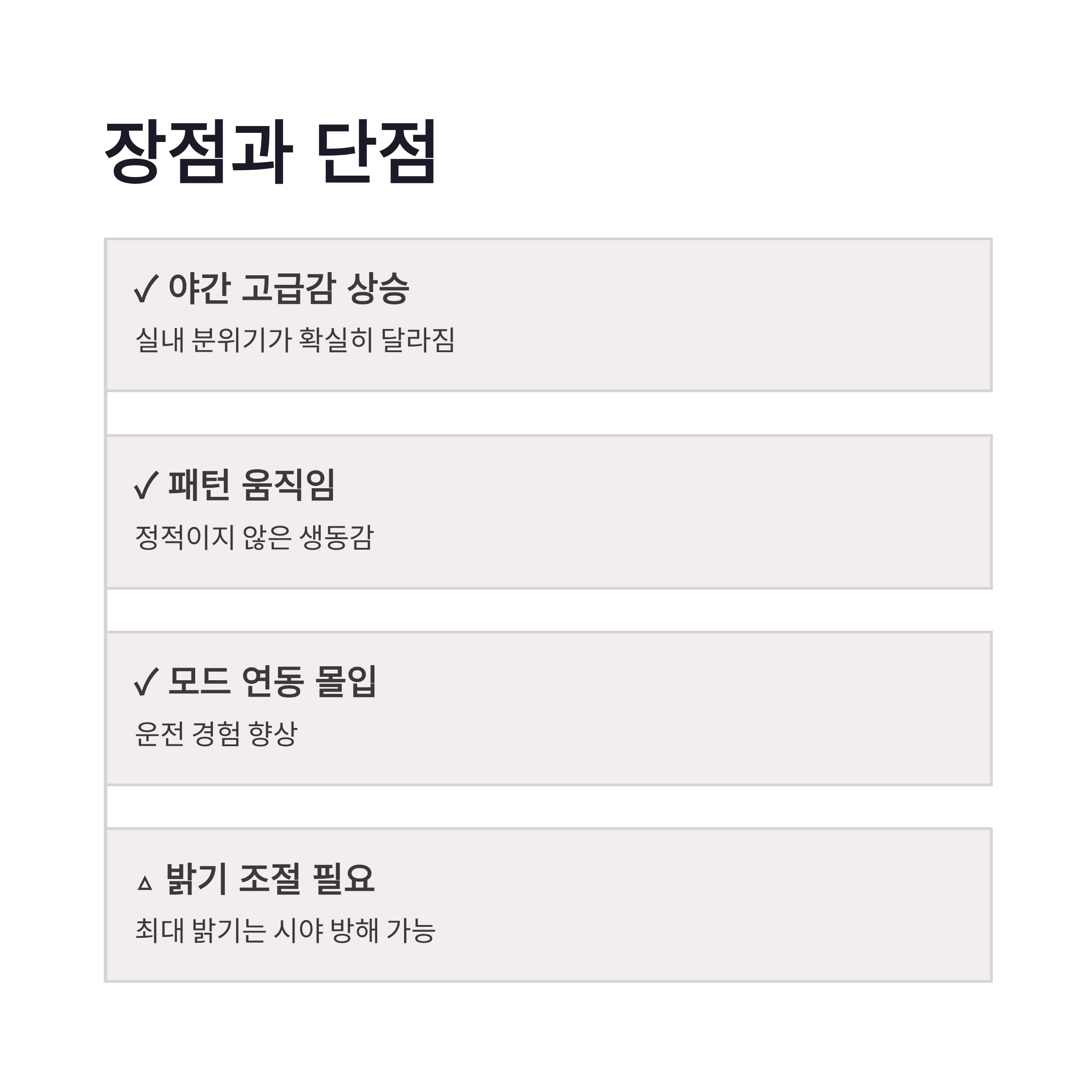 장점은 명확합니다. 첫째, 야간 주행 시 실내 고급감 상승. 둘째, 패턴 움직임 덕분에 정적인 느낌이 없음. 셋째, 운전 모드와 연동돼 몰입감 상승.