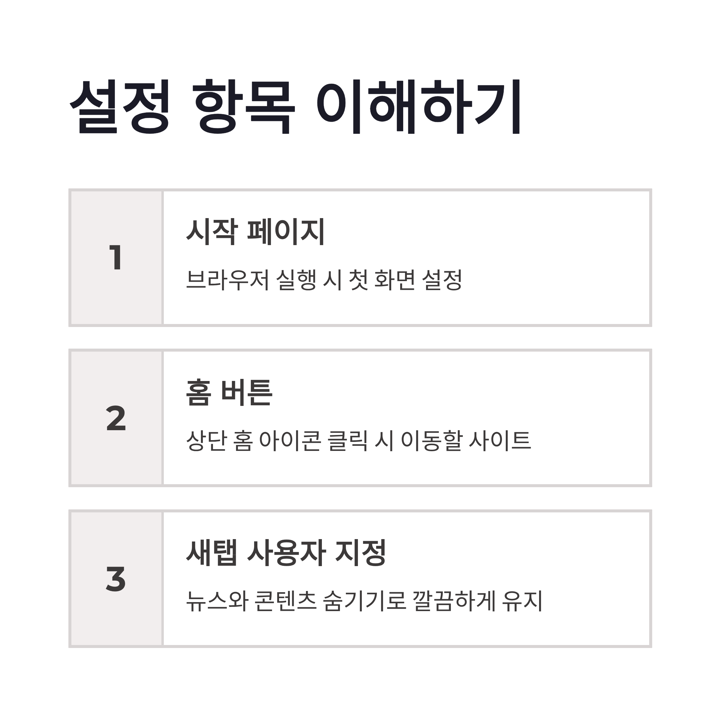 | 시작 페이지 | 브라우저 실행 시 첫 화면 | 네이버, 구글, 회사 포털 |
