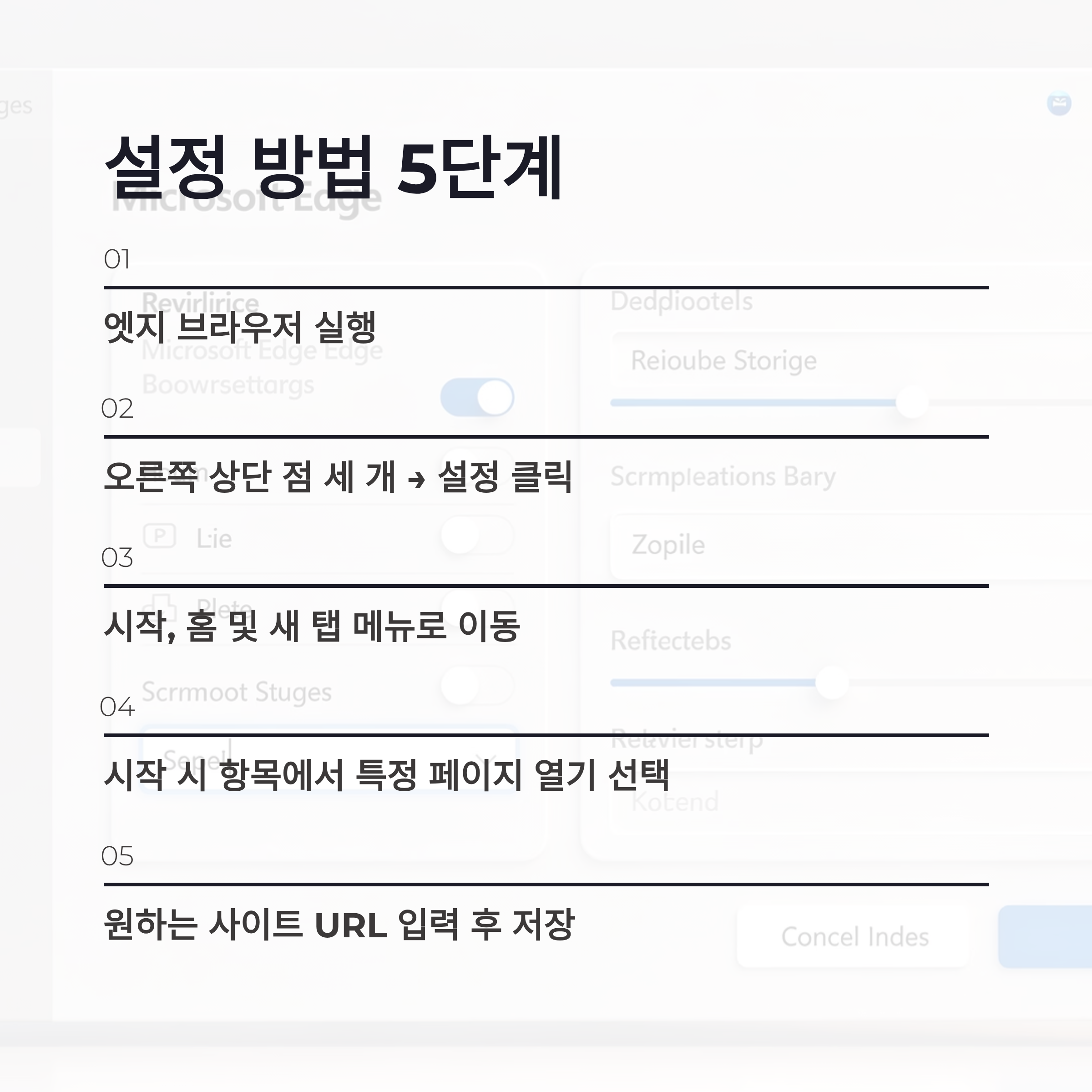 1️⃣ 엣지 브라우저 실행 2️⃣ 오른쪽 상단 점 세 개 → 설정 클릭 3️⃣ 시작, 홈 및 새 탭 메뉴로 이동 4️⃣ 시작 시 항목에서 ‘특정 페이지 열기’ 선택 5️⃣ 원하는 사이트 URL 입력 후 저장