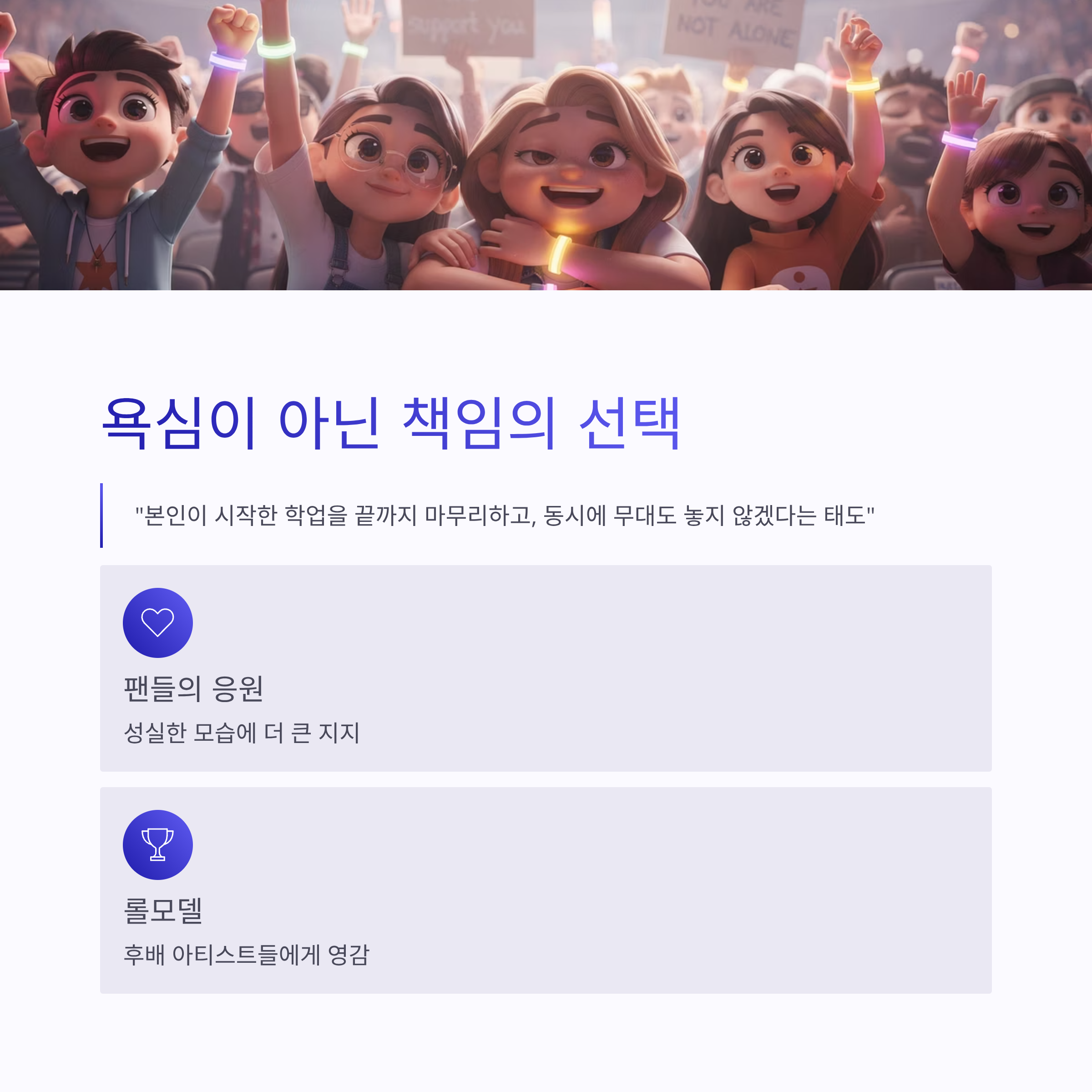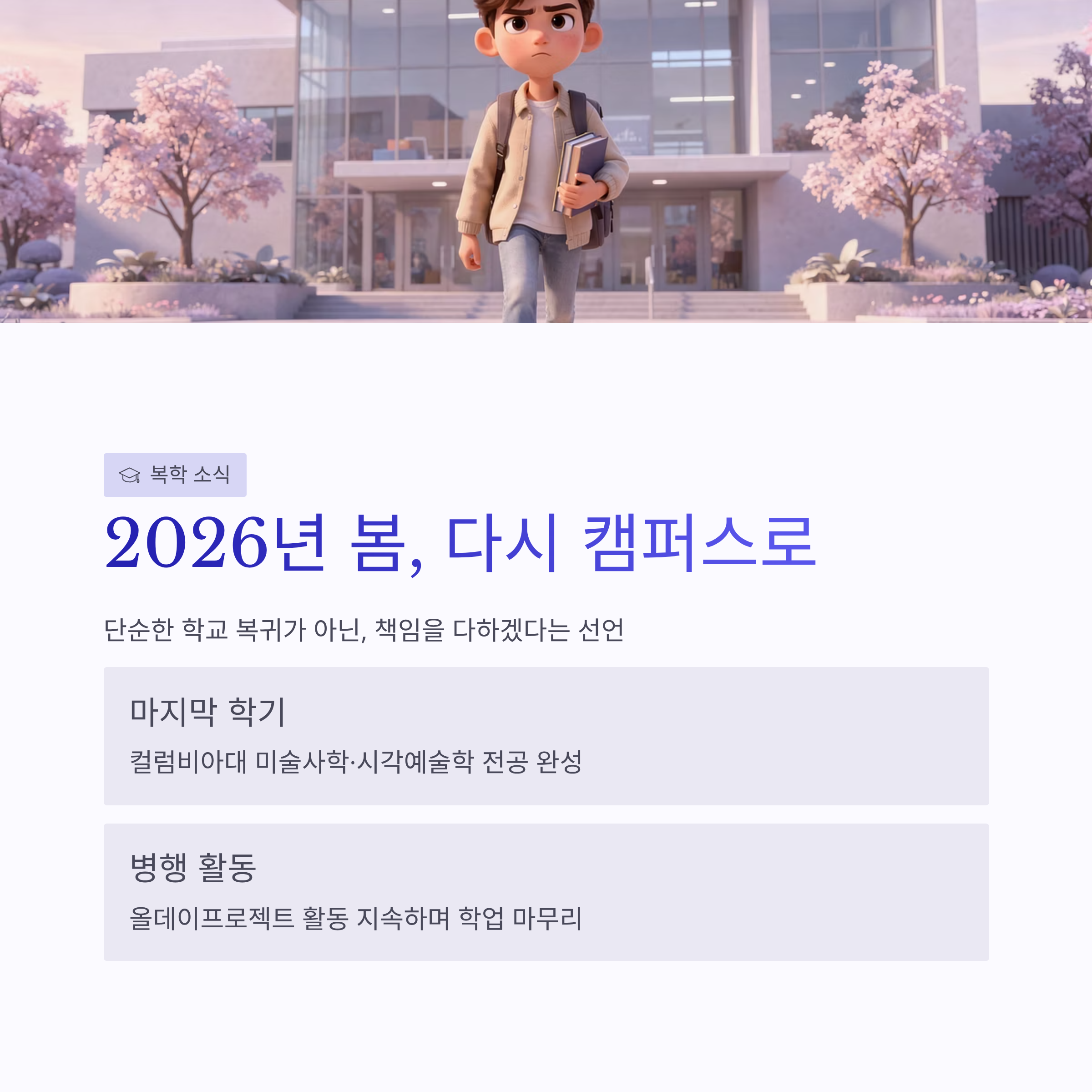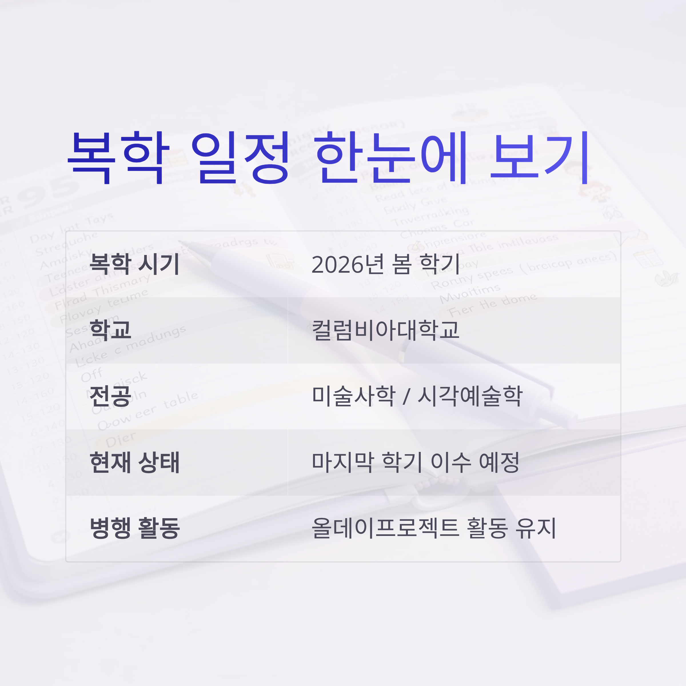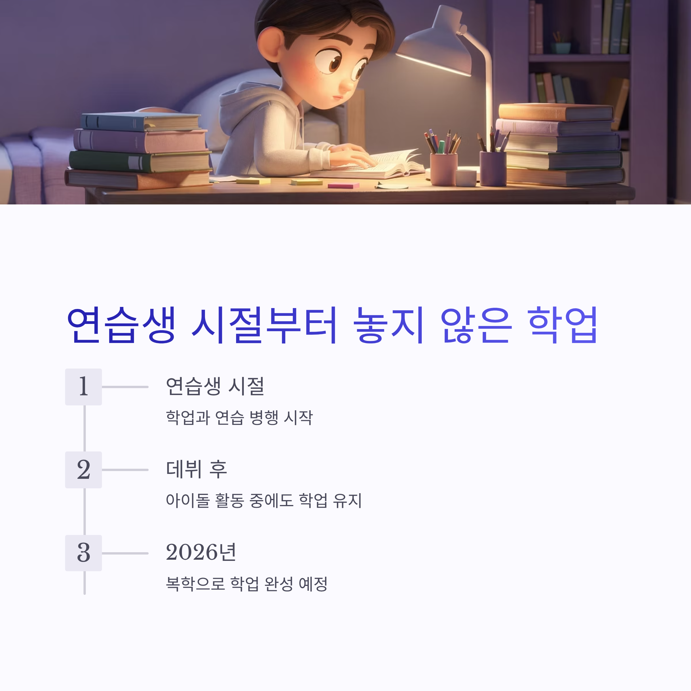 2026년 봄 학기부터 복학해서 마지막 학기를 마무리한다는 게 핵심이에요. 그냥 듣기엔 짧아 보이지만, 아이돌 활동 스케줄을 생각하면 결코 가벼운 일정은 아니더라구요. 저도 예전에 일하면서 공부 조금 병행해봤는데… 진짜 정신이 두 개쯤 필요하더라구요 ㅠㅠ