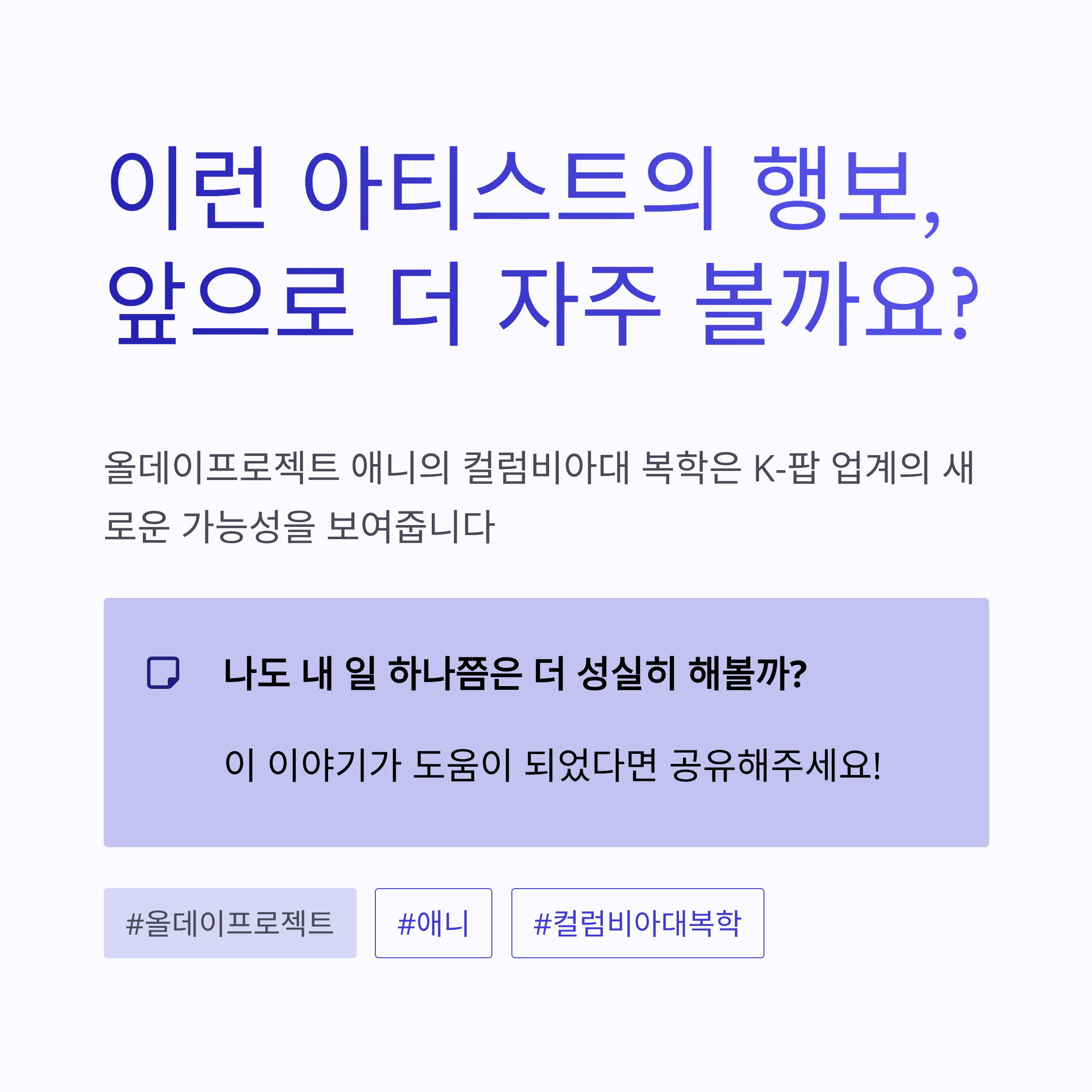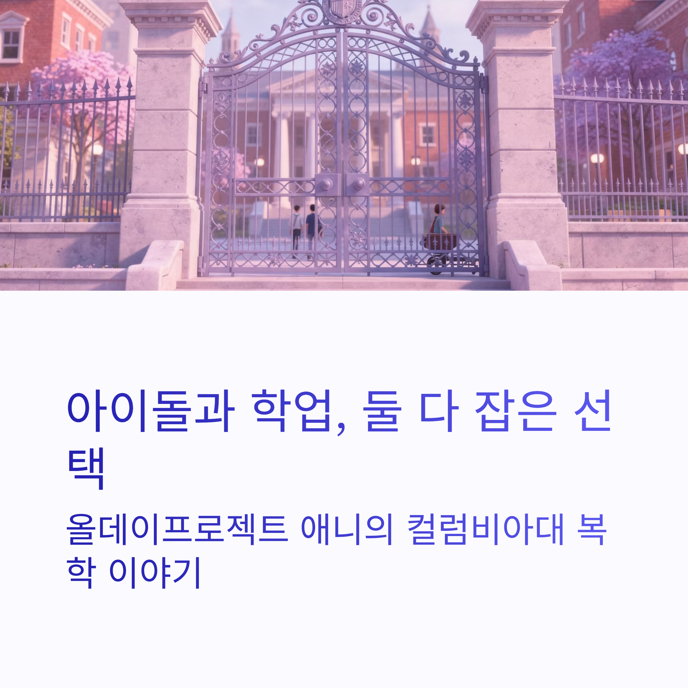 #올데이프로젝트 #애니 #컬럼비아대복학 #아이돌학업병행 #혼성그룹 #2026아이돌 #해외대학복학 #미술사학 #시각예술학 #아이비리그 #K팝트렌드 #연예계이슈 #학업열정 #커리어확장 #팬응원