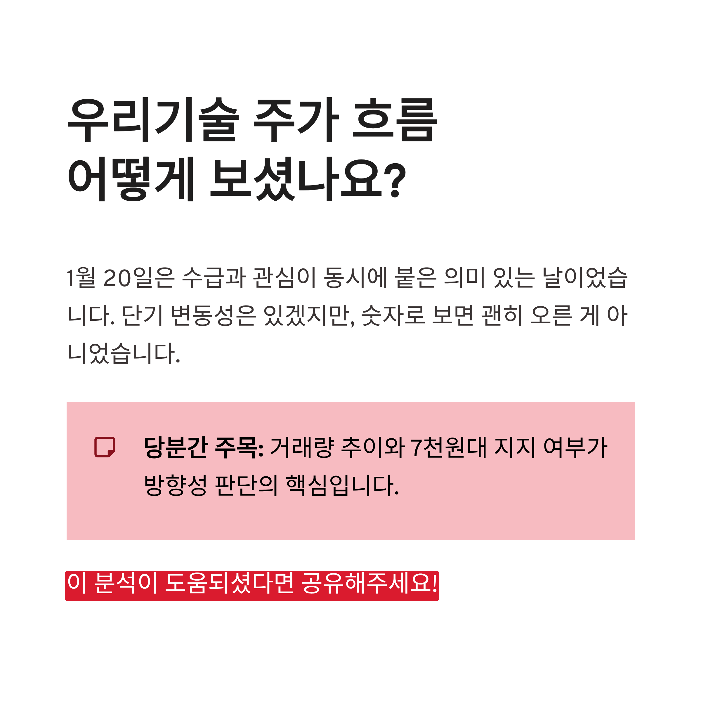정리해보면 1월 20일 우리기술 주가는 단순한 하루짜리 반짝임보다는, 수급과 관심이 동시에 붙은 날이었어요. 물론 단기 급등 종목 특유의 흔들림은 감안해야겠죠. 그래도 숫자로 다시 보니까 괜히 올랐던 건 아니라는 생각은 들었습니다. 당분간은 거래량과 7천 원대 지지 여부만 체크해도 방향성 판단에 도움 될 것 같구요. 이 흐름, 여러분은 어떻게 보셨나요?