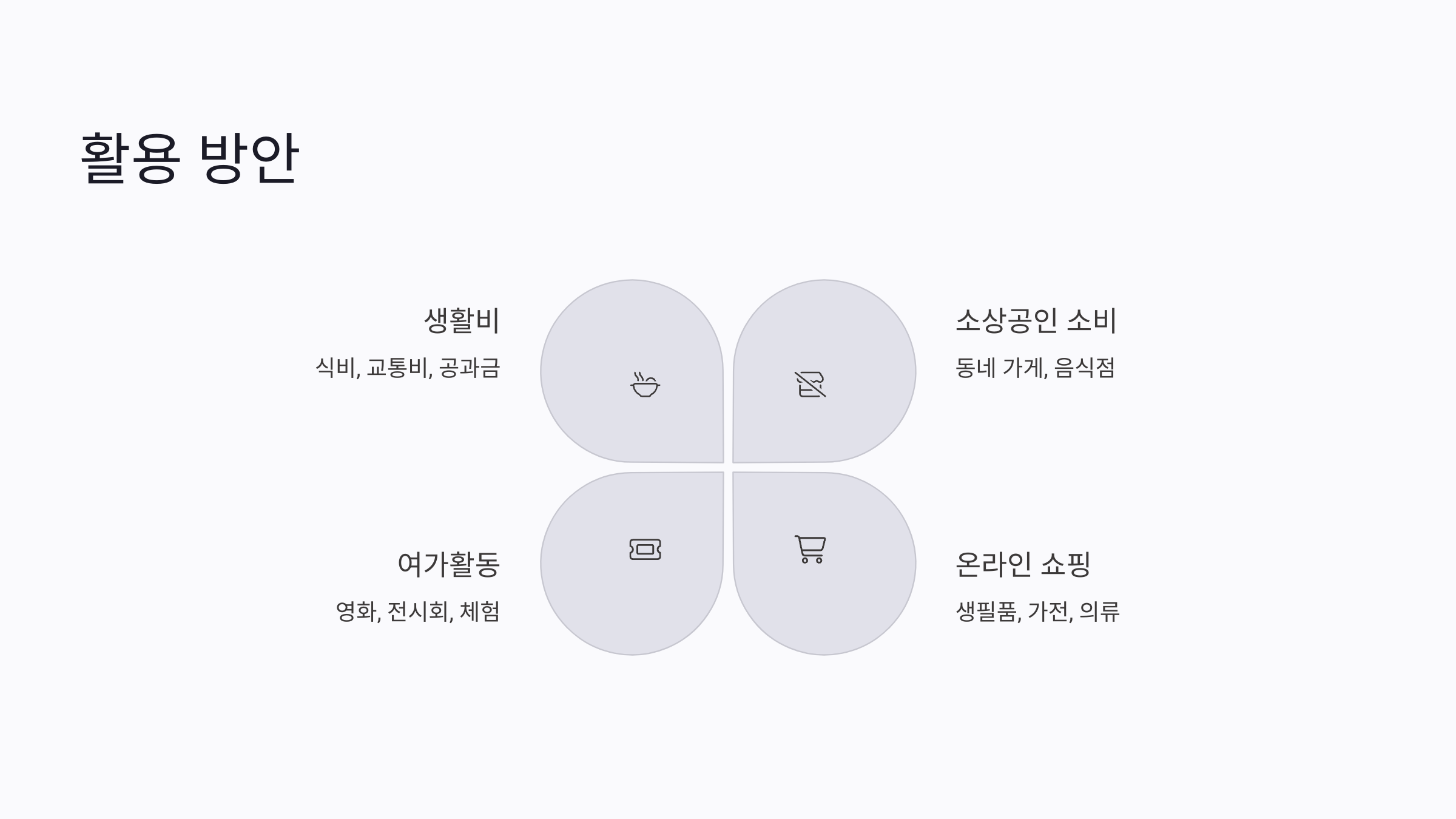 | 소상공인 소비 | 동네 가게, 미용실, 음식점 등에서 사용 |