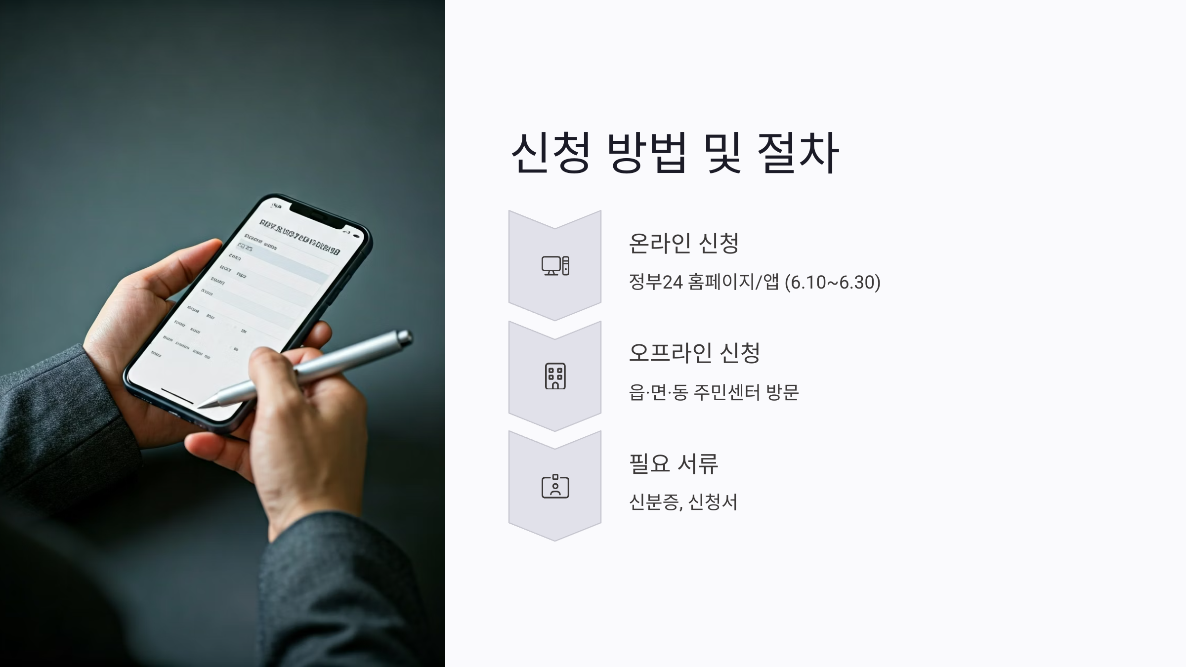- 정부24 앱: 스마트폰에서 설치 후 신청 가능