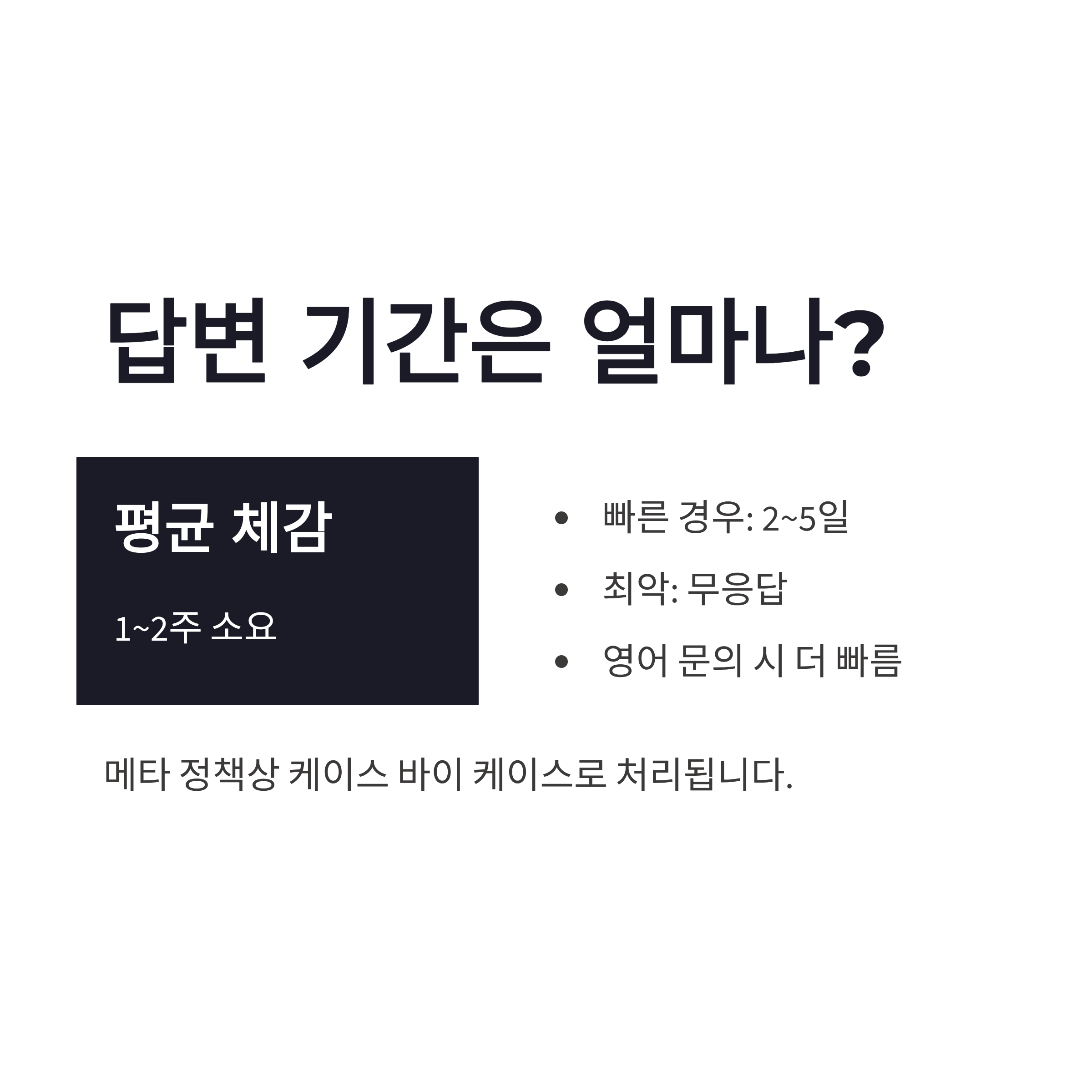 2026년 기준으로도 공식적으로 “며칠 안에 답변 준다” 이런 말은 없더라구요. 메타 쪽 정책 자체가 케이스 바이 케이스라서 그래요. 그리고 영어로 문의했을 때가 한국어보다 처리 속도가 빠르다는 얘기도 꽤 많았어요. 저도 테스트 삼아 영어로 썼을 때 답변이 먼저 오긴 했습니다. 무조건은 아니지만, 체감상 차이는 있었어요.
