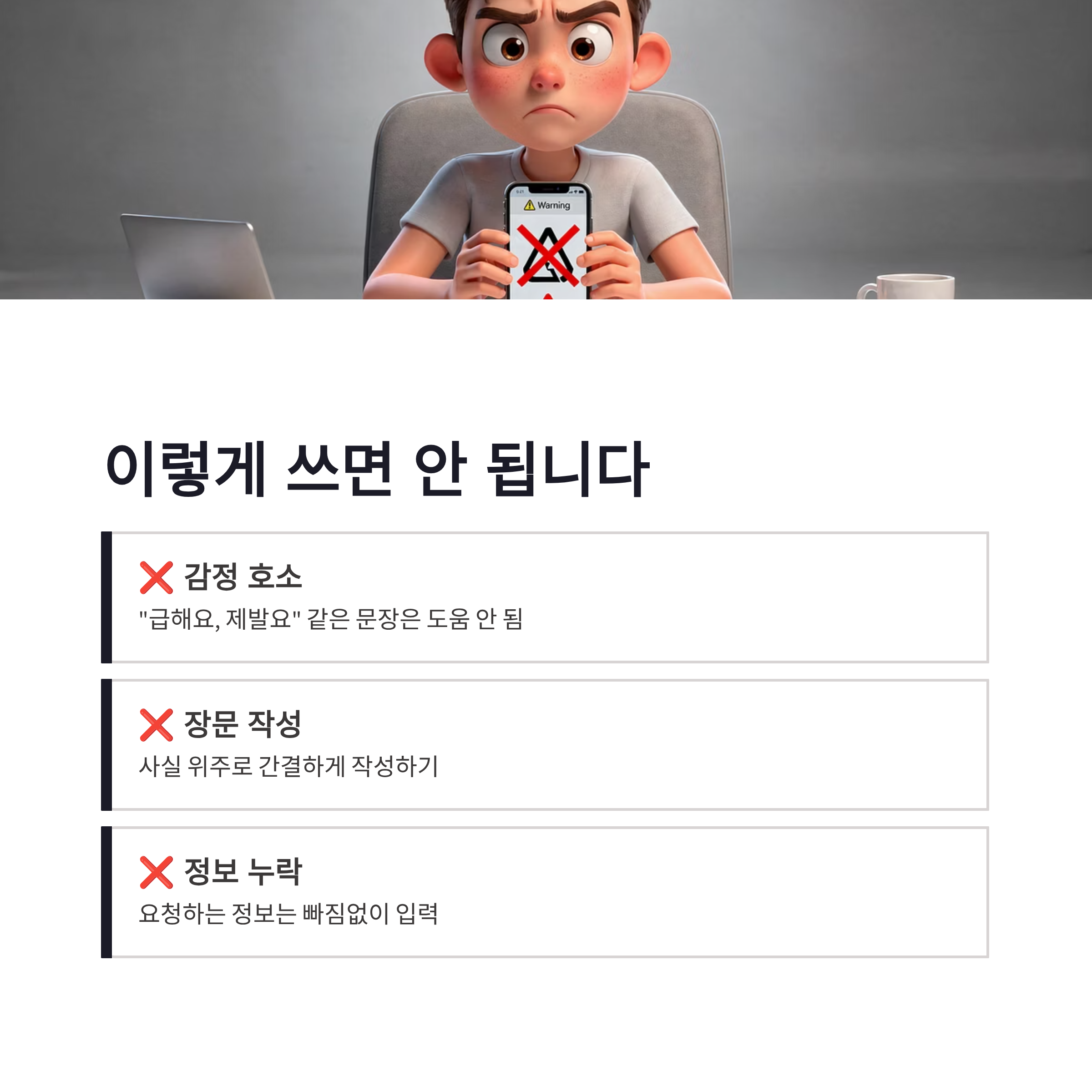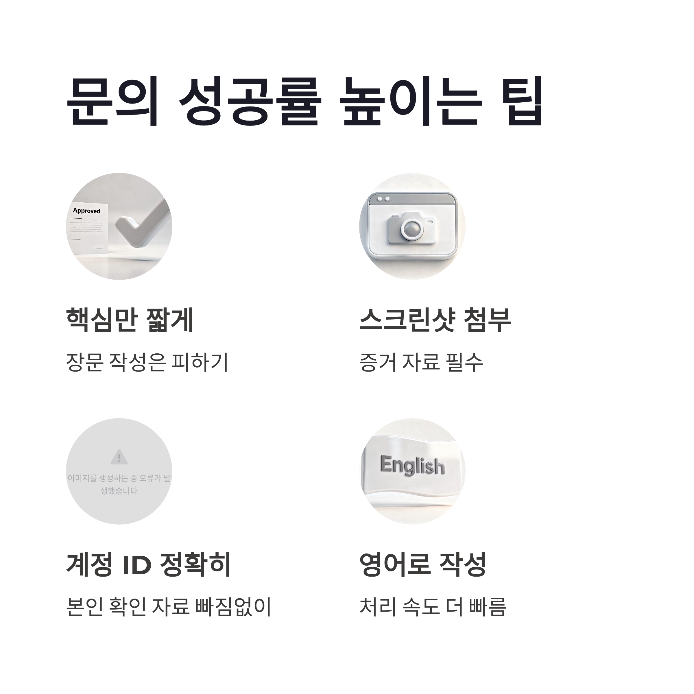 * 장문 ❌ → 핵심만 짧게 * 감정 호소 ❌ → 사실 위주 * 스샷 첨부 ⭕ * 계정 ID 정확히 기재 ⭕ * 영어 가능하면 영어로 작성 ⭕