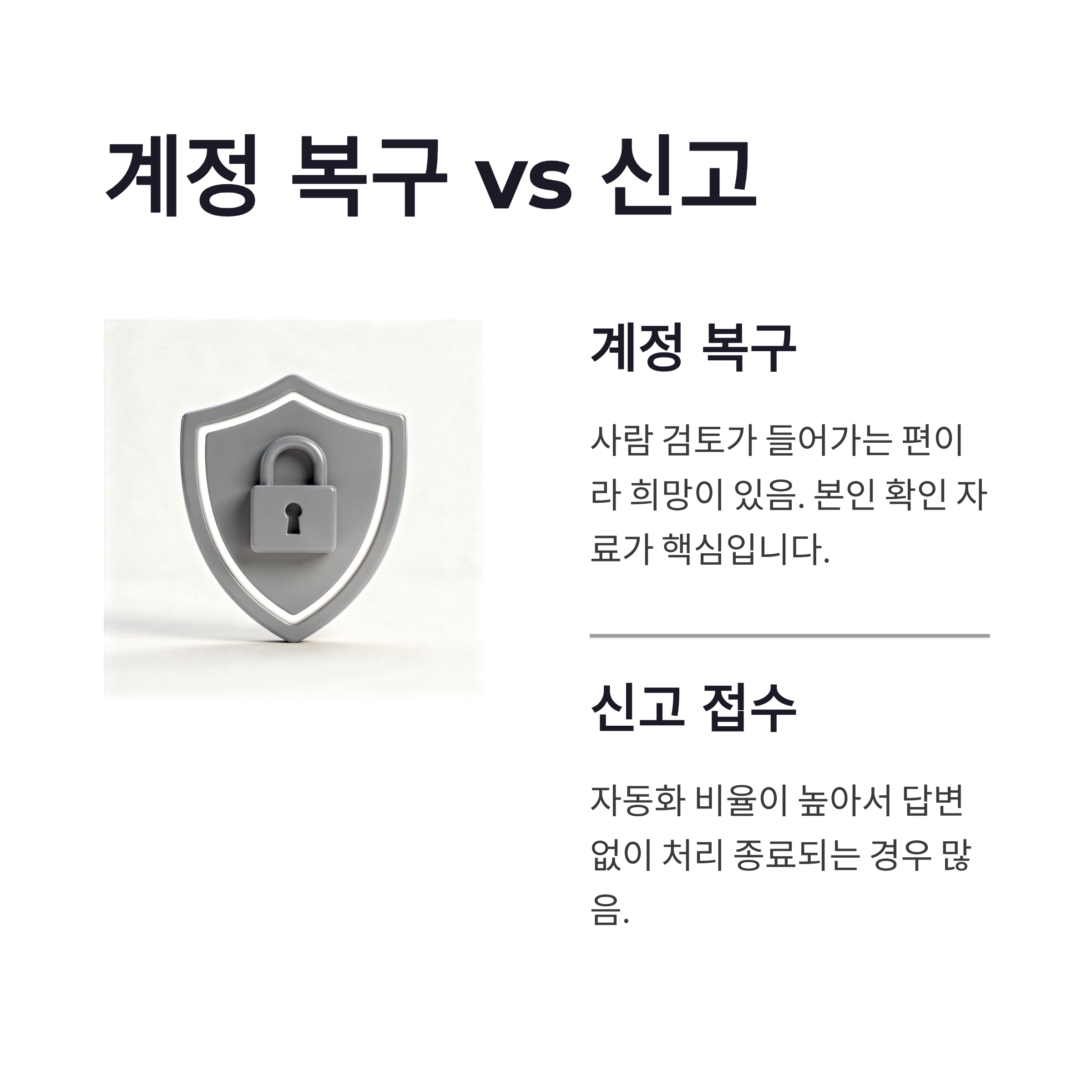 | 계정 복구 | 계정 비활성화/해킹 전용 폼 | 신분 확인 요구 | 중간~높음 |