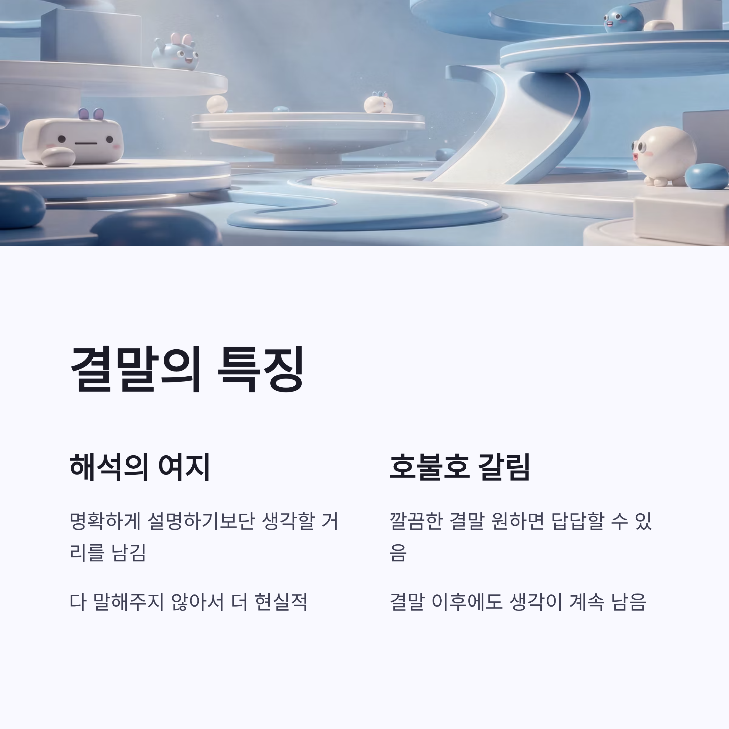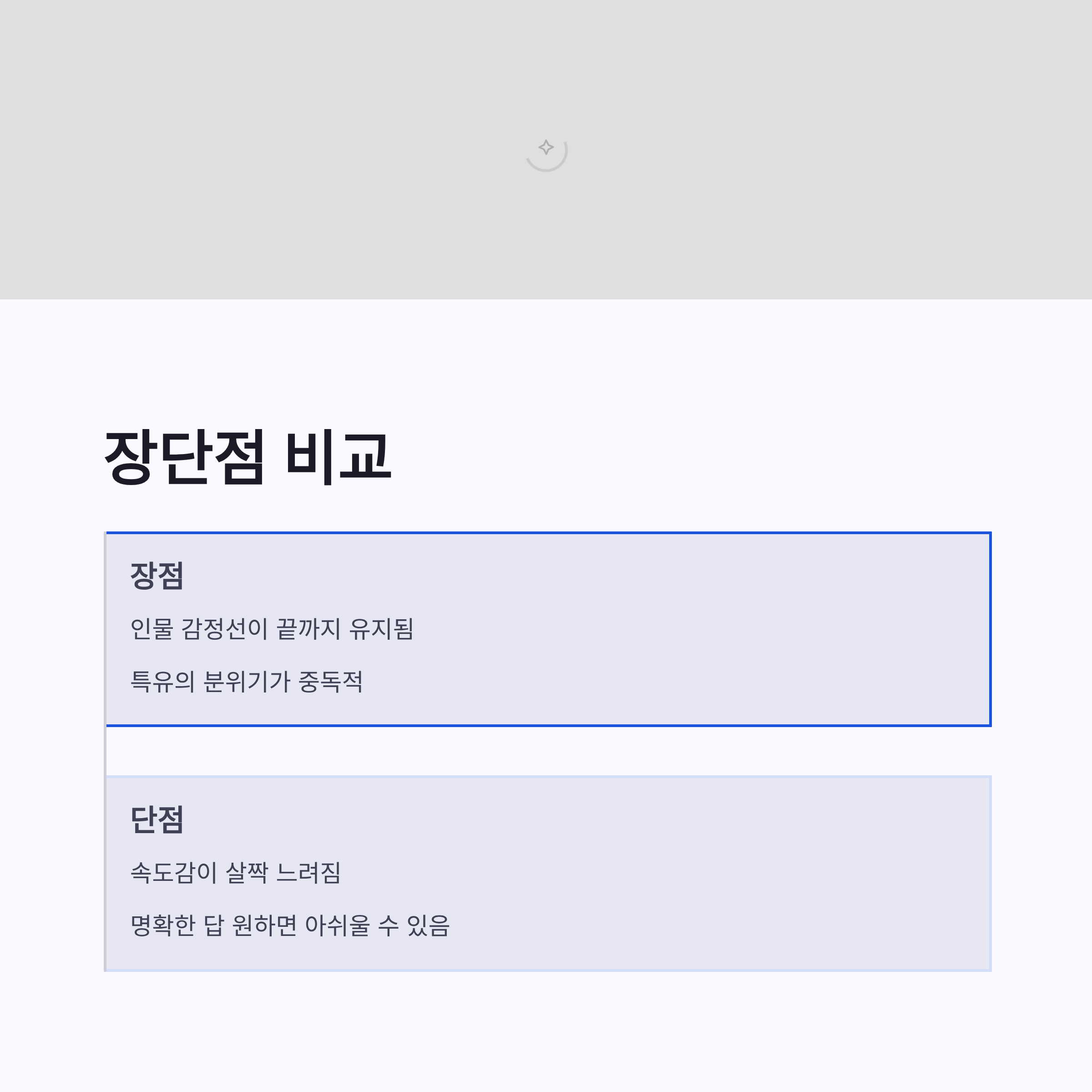 결말 쪽으로 갈수록 자백의 대가는 명확하게 설명해주기보단 해석의 여지를 남겨요. 이게 호불호 갈릴 포인트 같아요. 저는 개인적으로 “다 말해주지 않아서 더 현실적”이라고 느꼈는데, 깔끔한 결말 좋아하는 분들은 답답할 수도 있겠더라구요. 장점은 인물 감정선이 끝까지 유지된다는 점, 단점은 속도감이 살짝 느려진다는 점 정도? 그래도 자백의 대가 특유의 분위기 덕분에 결말 이후에도 생각이 계속 남아요. 이게 은근히 중독됨…ㅠㅠ