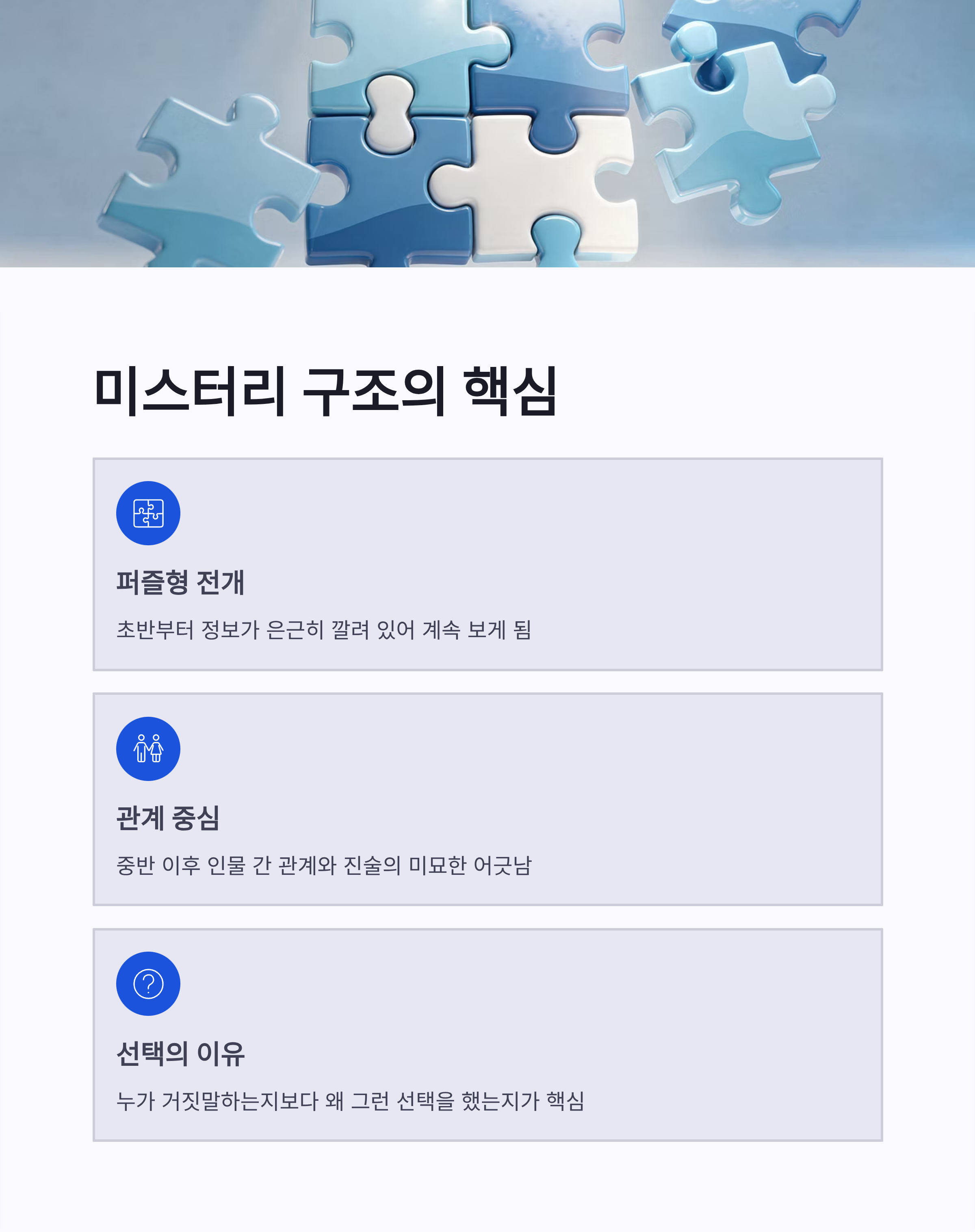 | 구분 | 핵심 포인트 | 체감 느낌 | | -- | ----------- | ---------- | | 초반 | 사건 제시·인물 배치 | 살짝 느리지만 탄탄 | | 중반 | 자백과 거짓 교차 | 몰입도 급상승 | | 후반 | 진실의 무게 | 여운 남음 |