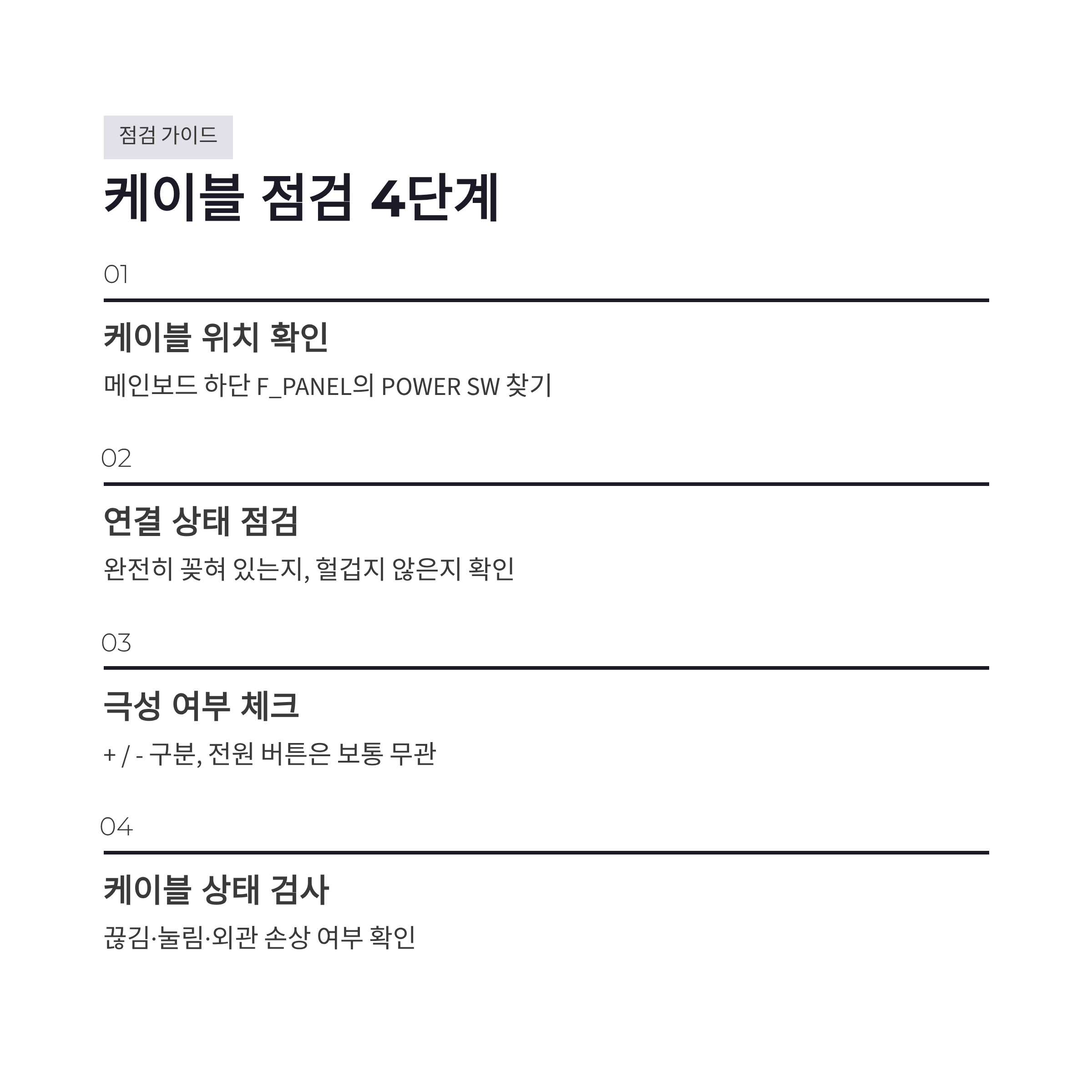 | 케이블 상태 | 끊김·눌림 | 외관 손상 확인 |