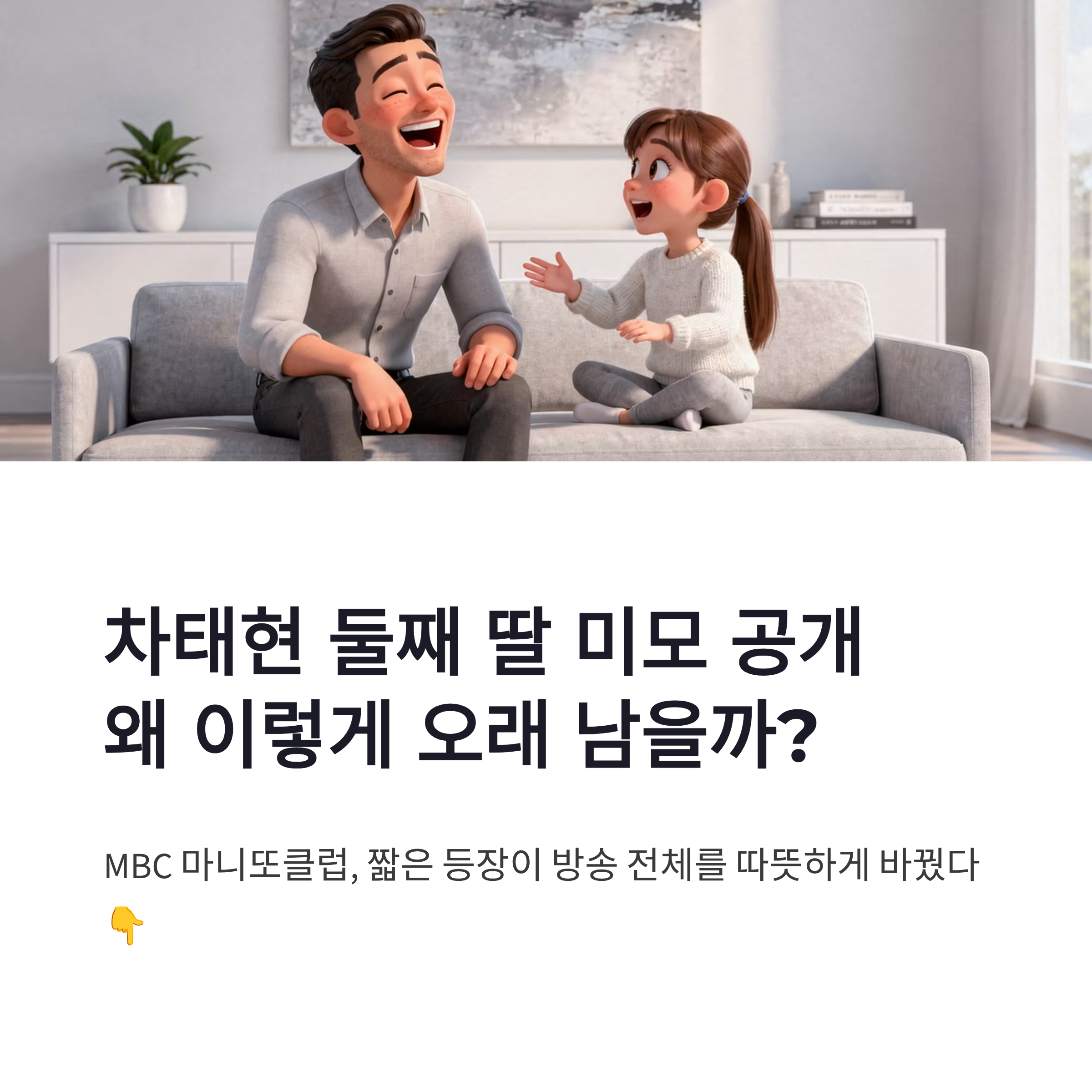 차태현 둘째 딸 미모 공개 장면은 잠깐 지나간 가족 등장으로 보이지만, 실제로는 성장의 시간과 부녀 케미, 그리고 차태현 특유의 편안한 예능 감각이 함께 드러난 순간이었습니다. 과하게 만들지 않았기 때문에 더 진짜 같았고, 그래서 더 오래 남았습니다. 마니또클럽 속 이 짧은 장면이 좋은 반응을 얻은 이유는 결국 가족의 자연스러운 온도에 있었습니다.