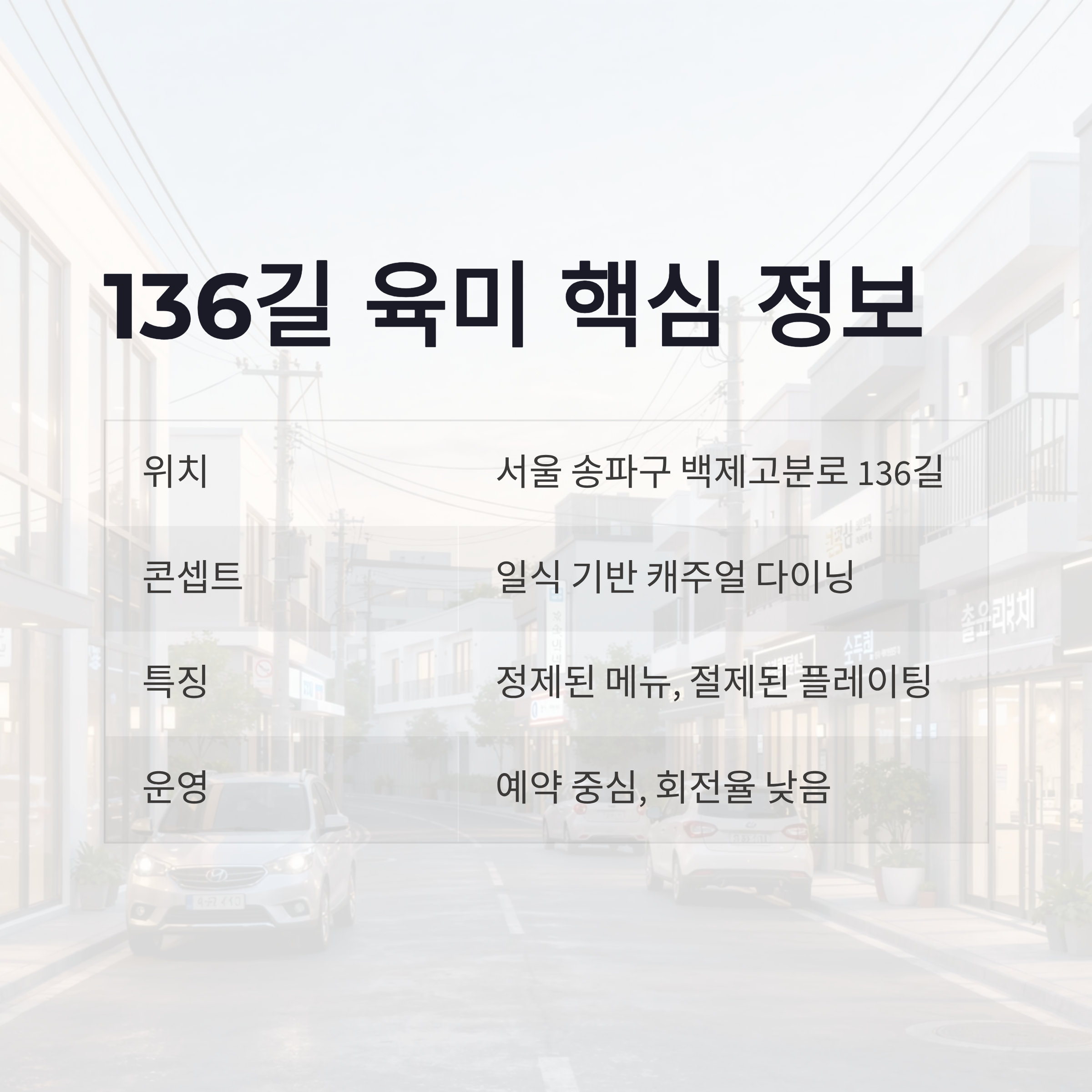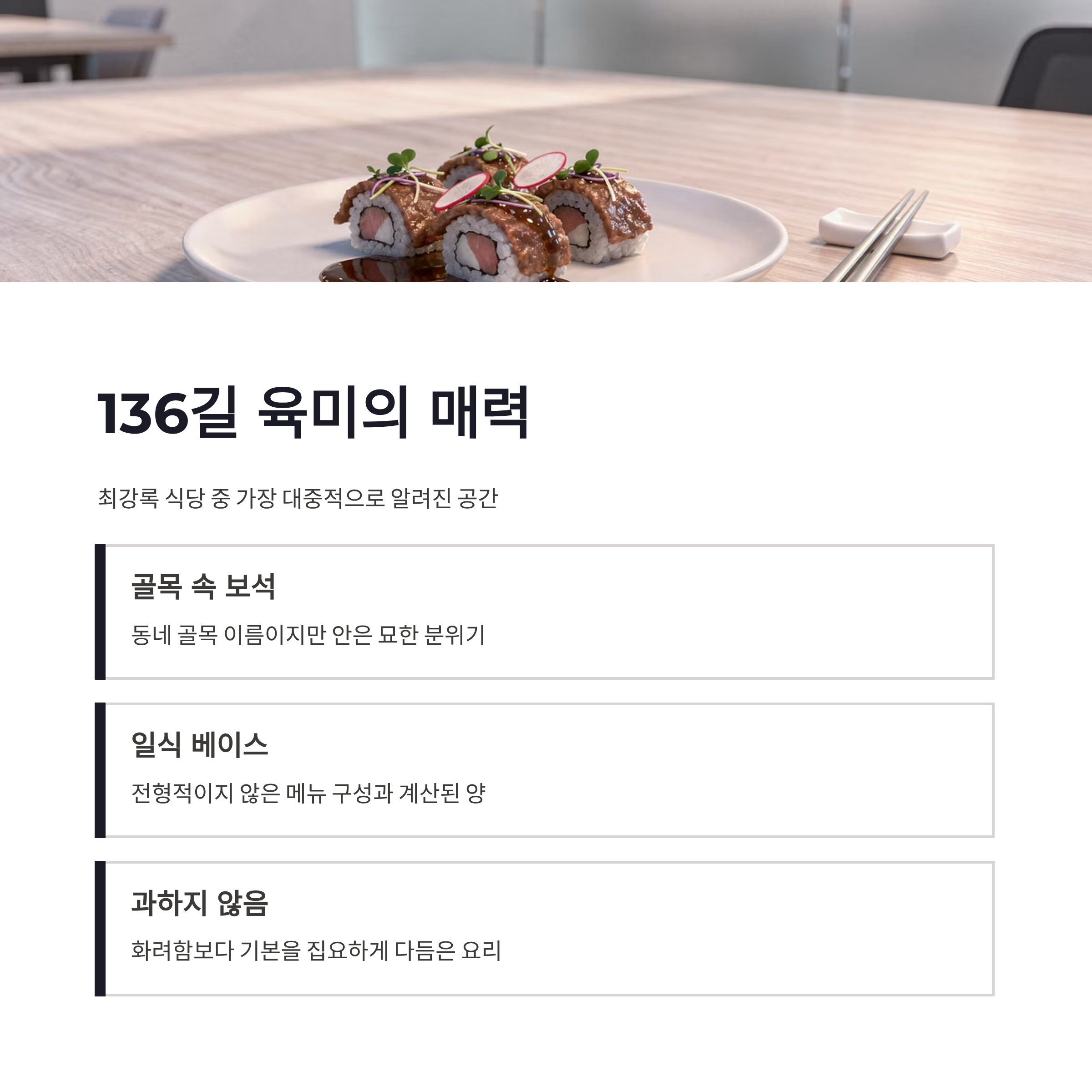 136길 육미는 최강록 식당 중에서도 가장 대중적으로 알려진 공간이었어요. 136길 육미 이름부터 동네 골목 느낌인데, 안에 들어가면 분위기가 꽤 묘했습니다. 메뉴는 일식 베이스지만 전형적이지 않았고, 양이나 구성도 계산이 느껴졌어요. 제가 인상 깊었던 건 ‘과하지 않음’이었는데요. 요즘 유행 따라 화려하게 가는 게 아니라, 기본을 아주 집요하게 다듬은 느낌이랄까… 그래서 재방문율이 높았던 것 같아요.
