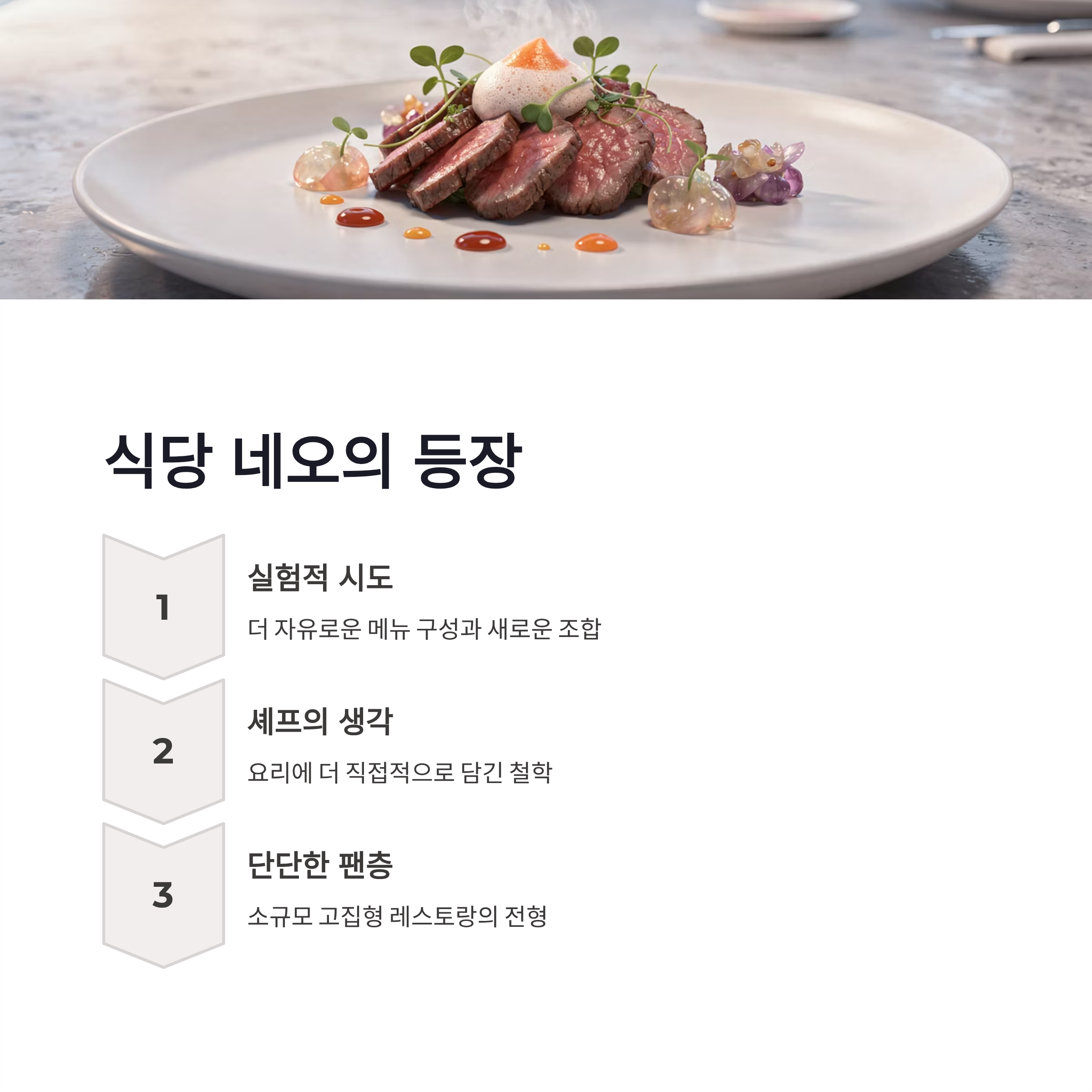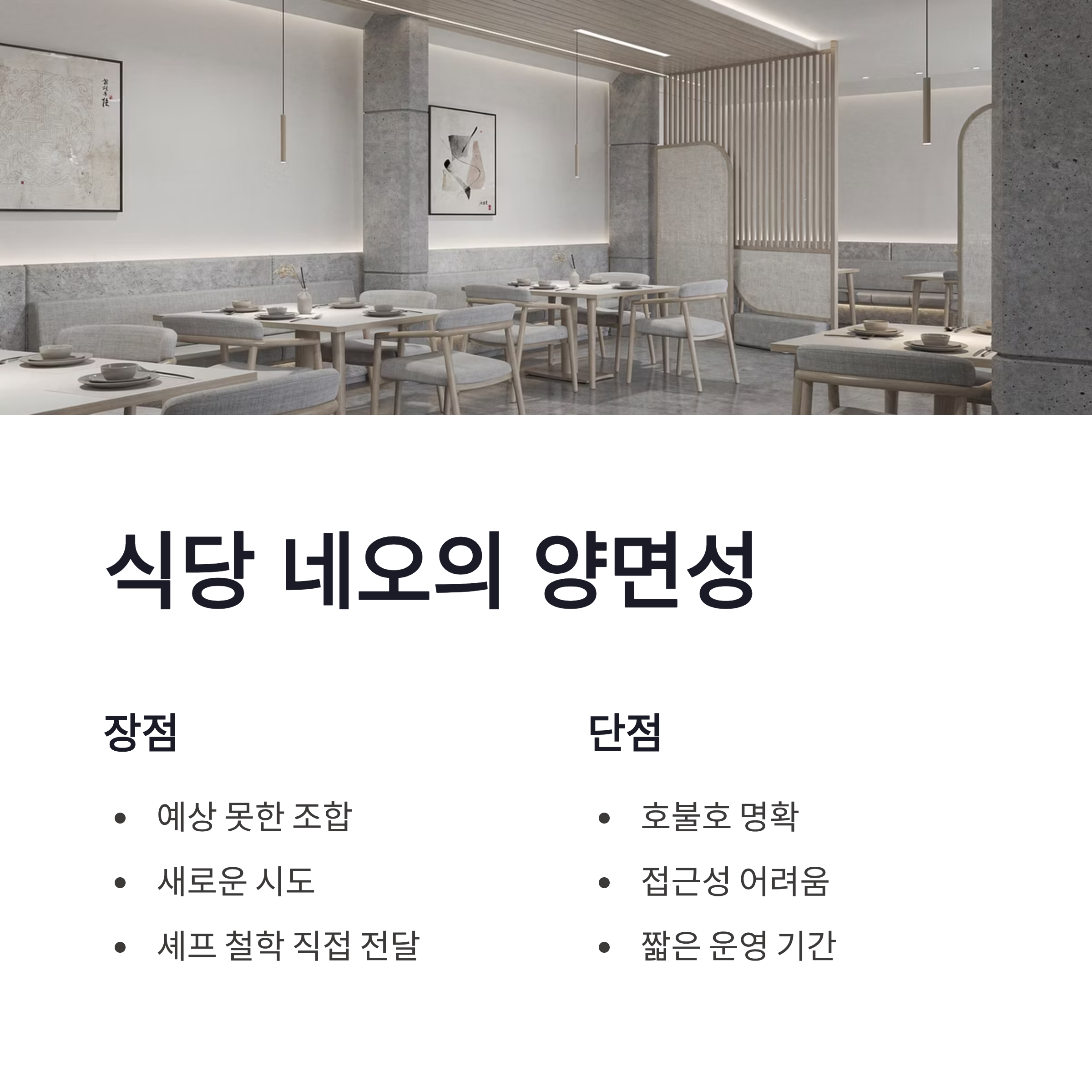 이후 등장한 식당 네오는 분위기가 또 달랐습니다. 식당 네오 최강록 식당 네오는 실험적인 요소가 더 강했고, 메뉴 구성도 더 자유로웠어요. 장점은 분명했죠. 새로운 시도, 예상 못 한 조합, 셰프의 생각이 더 직접적으로 느껴졌거든요. 반면 단점도 있었어요. 호불호가 확 갈렸고, 접근성이 쉽진 않았습니다. 요즘 트렌드인 ‘소규모 고집형 레스토랑’의 전형 같았달까요. 그래서 더 팬층이 단단해졌고, 동시에 짧은 운영으로 아쉬움을 남겼던 것 같아요.