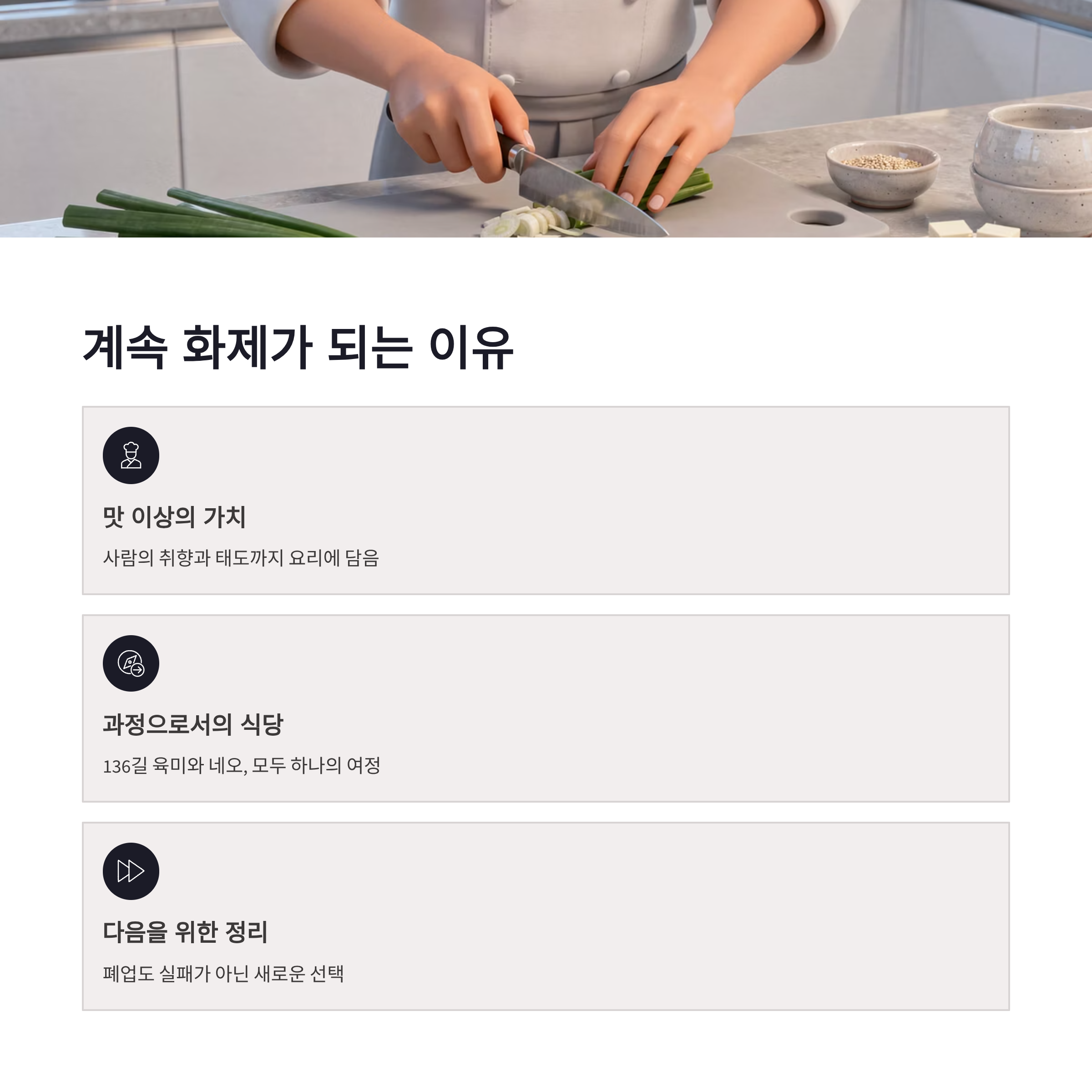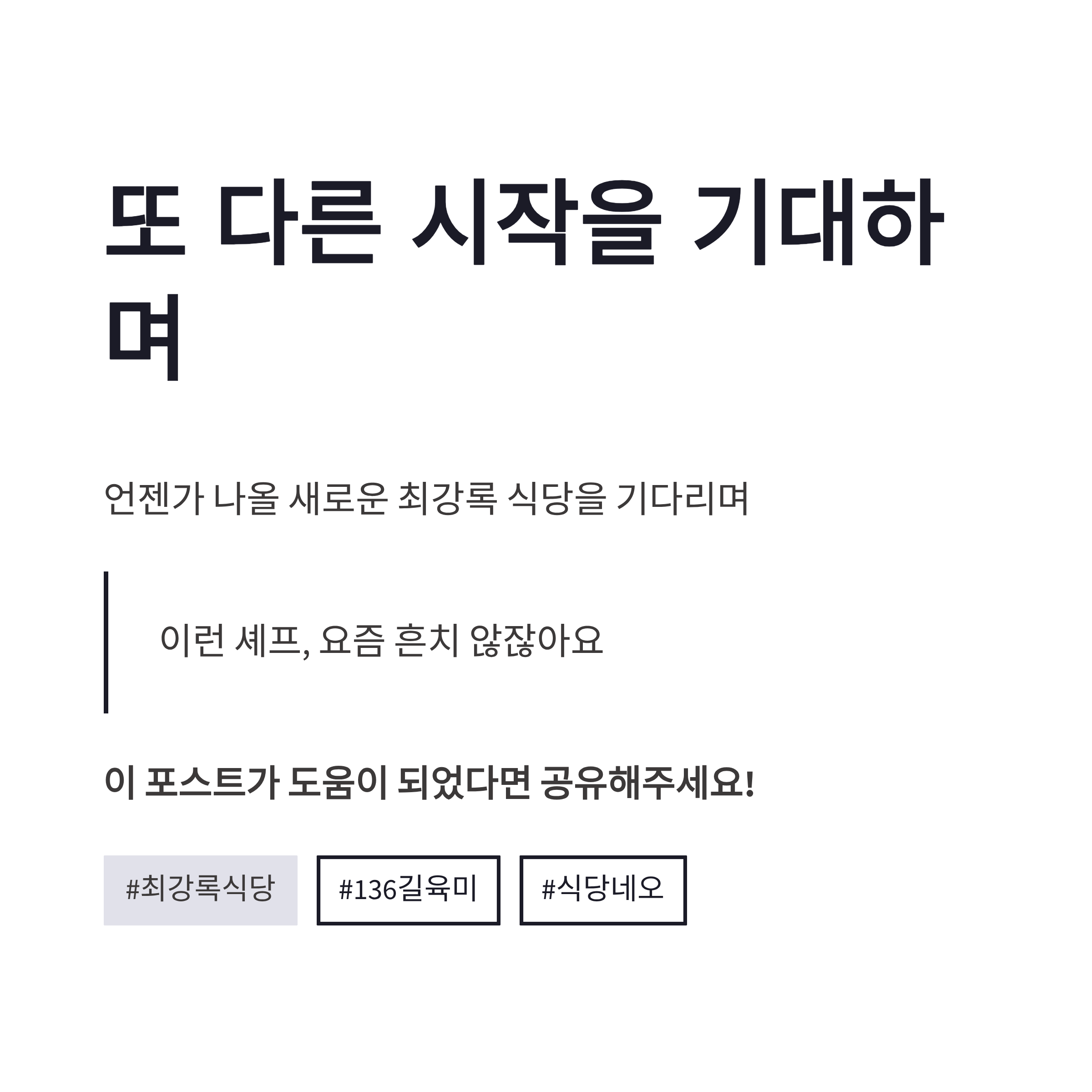 정리해보면 최강록 식당이 매번 화제가 되는 이유는 간단해요. 맛만으로 승부하지 않고, 사람의 취향과 태도까지 요리에 담았기 때문이죠. 136길 육미든, 식당 네오든 결과적으로는 하나의 과정처럼 느껴졌구요. 폐업조차도 실패라기보단 다음 선택을 위한 정리처럼 보였습니다. 개인적으로는 언젠가 또 다른 최강록 식당이 나오지 않을까 은근히 기대 중이에요. 이런 셰프, 요즘 흔치 않잖아요 ㅎㅎ