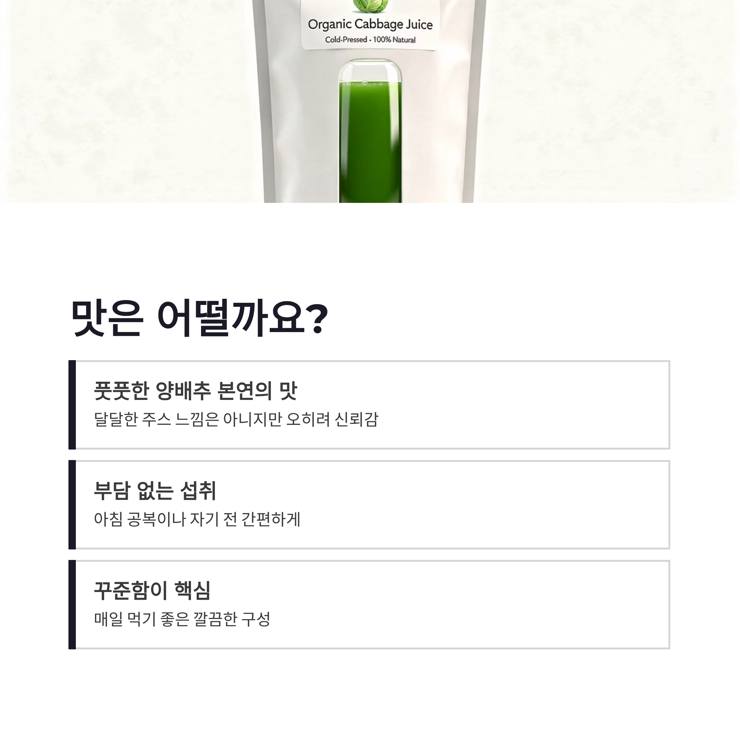 맛은 솔직히 말하면 달달한 주스 느낌은 아니에요. 양배추 특유의 풋풋한 맛이 있는데, 저는 오히려 그게 더 신뢰 갔습니다. 아침 공복이나 자기 전 부담 없이 먹기 좋았구요. 푸드버킷 유기농 양배추즙은 꾸준히 먹는 용도로 구성 자체가 깔끔한 타입이라는 느낌이 강했습니다.