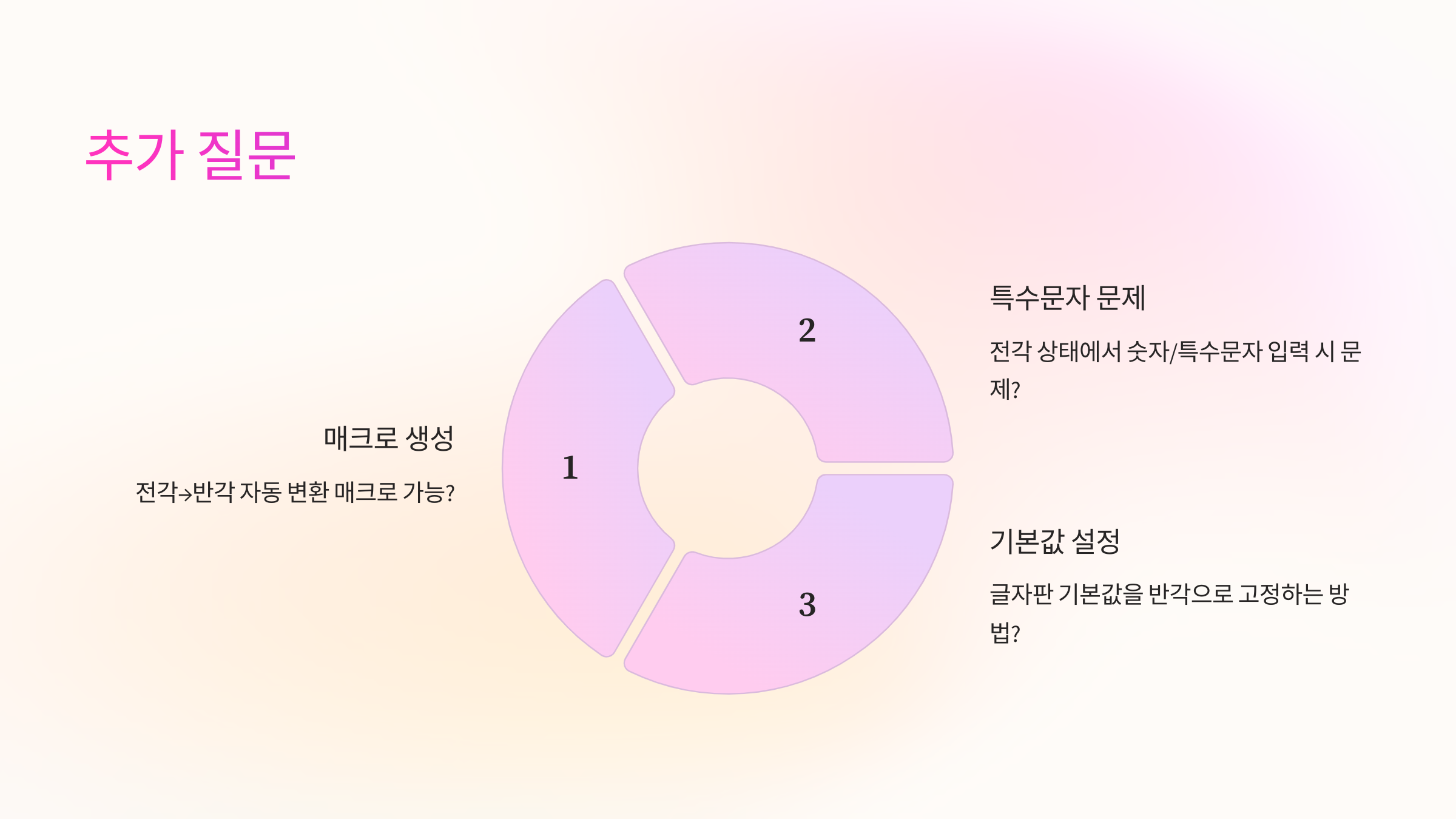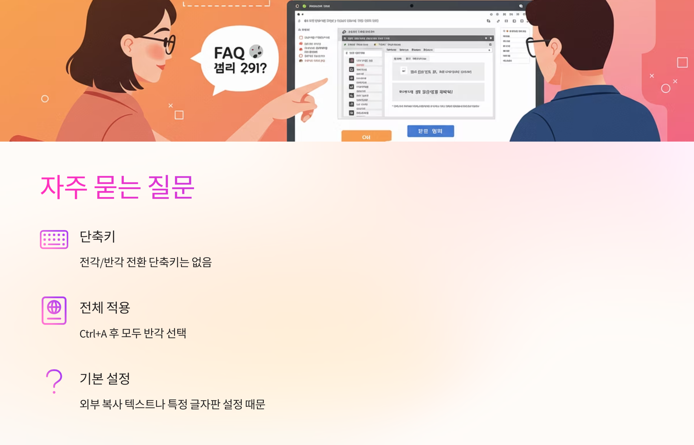 A. 외부에서 복사한 텍스트나, 특정 글자판에서 기본이 전각으로 설정되어 있는 경우가 많아요. 한 번만 설정 바꿔주면 해결됩니다!