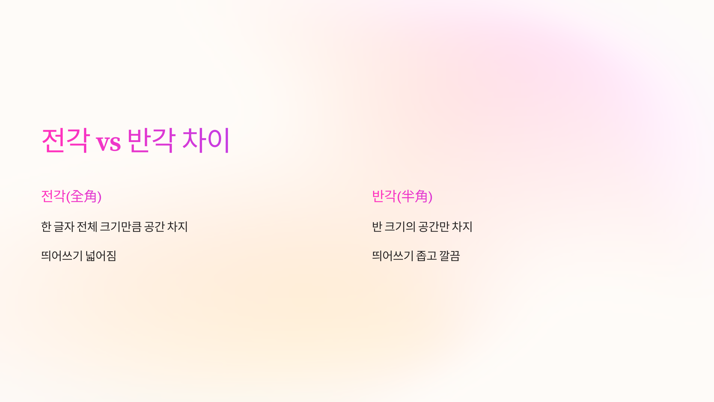 - 반각(半角): 반 크기의 공간만 차지 (띄어쓰기 좁고 깔끔)