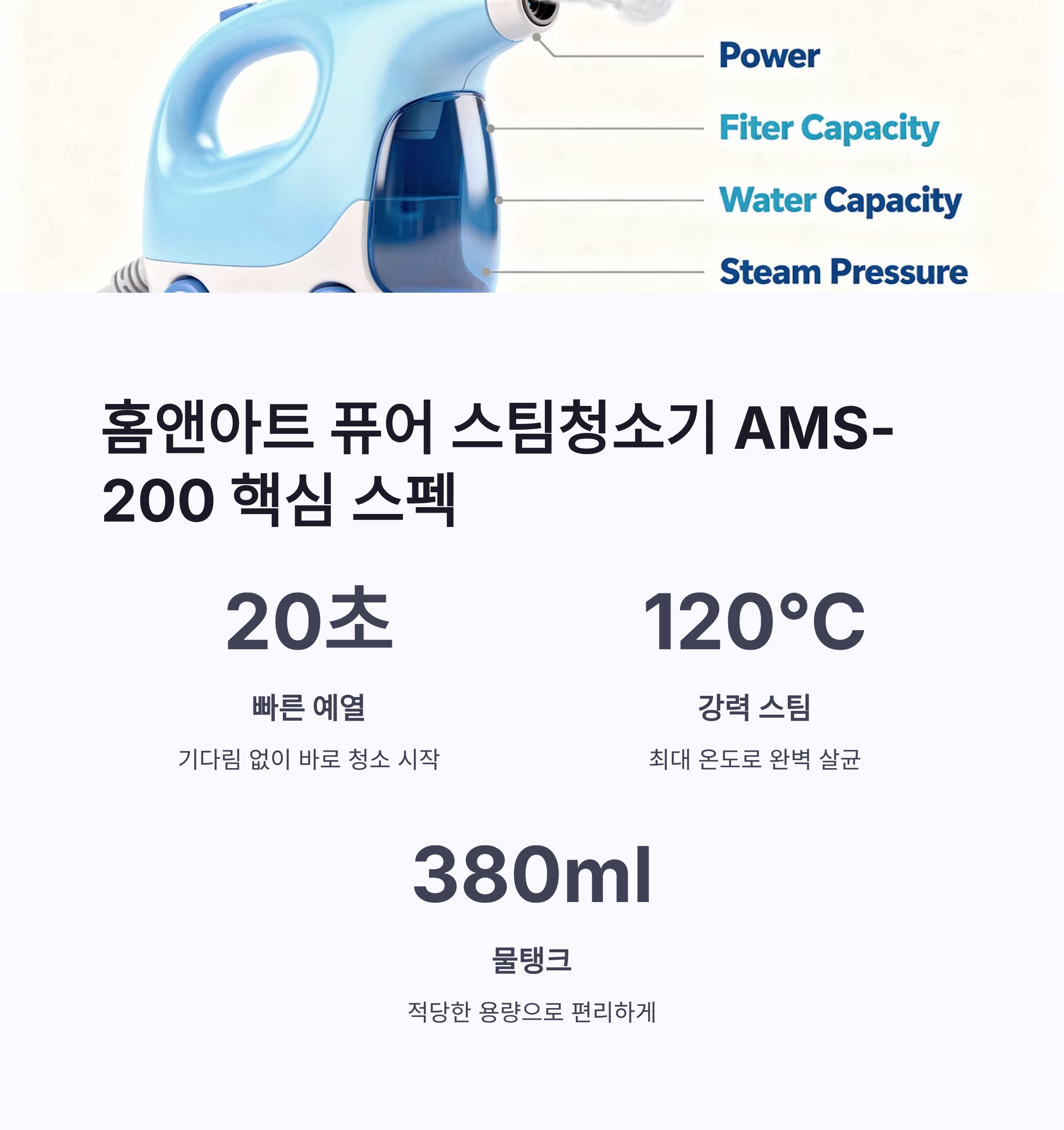 2025년 기준으로 스팀청소기 시장이 확실히 커졌더라구요. 미세먼지, 세균, 알러지 걱정 때문에 고온 살균 제품 선호도가 높아졌대요. 홈앤아트 퓨어 스팀청소기 AMS-200의 장점은 살균력, 빠른 예열, 세제 없는 청소! 단점이라면 물탱크가 아주 큰 편은 아니라 넓은 집은 중간에 한 번 보충해야 한다는 점? 그래도 가격대 생각하면 납득 가능했구요. 비슷한 가격대 제품 중에서는 출력이 안정적인 편이라 개인적으로 만족도 높았어요.