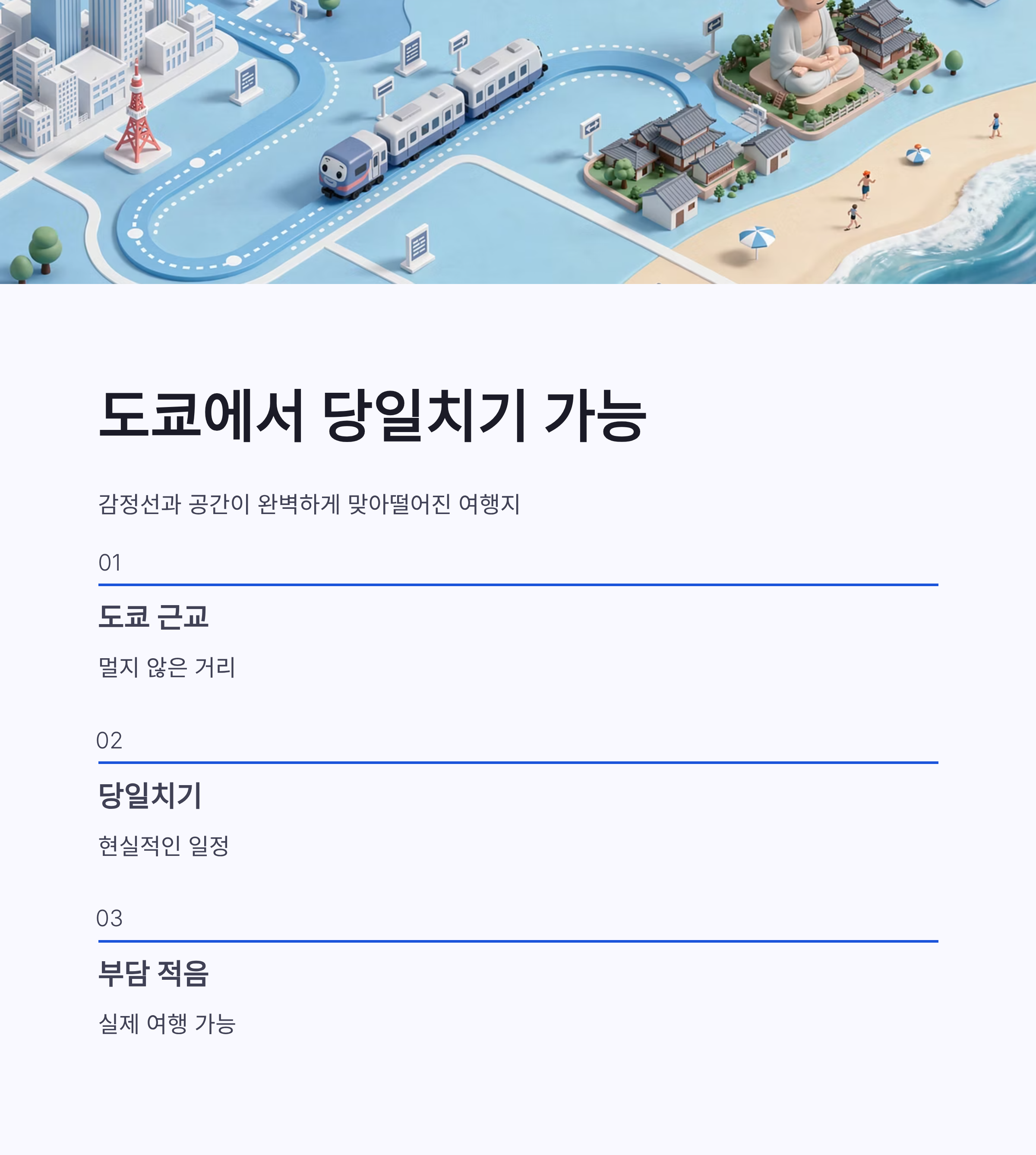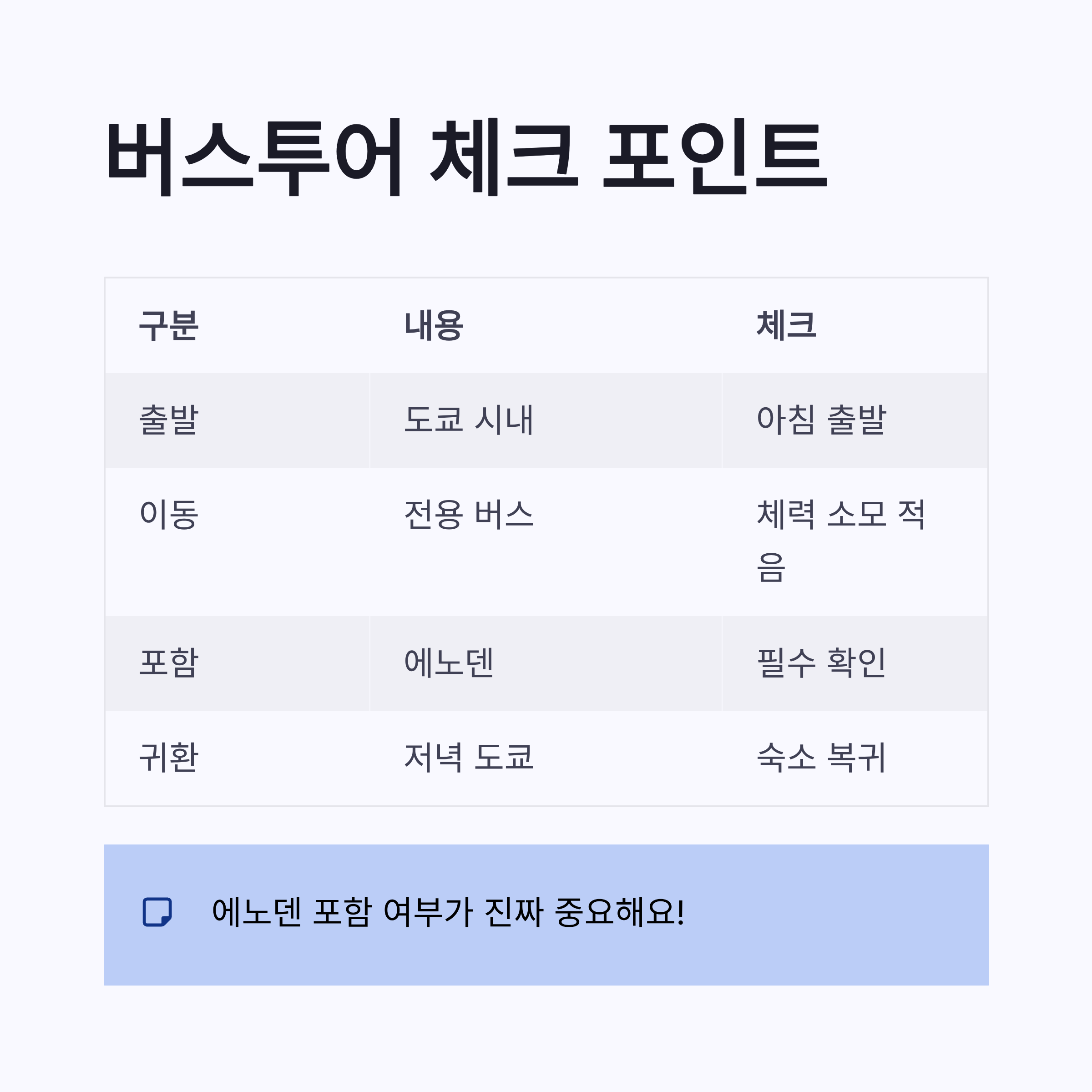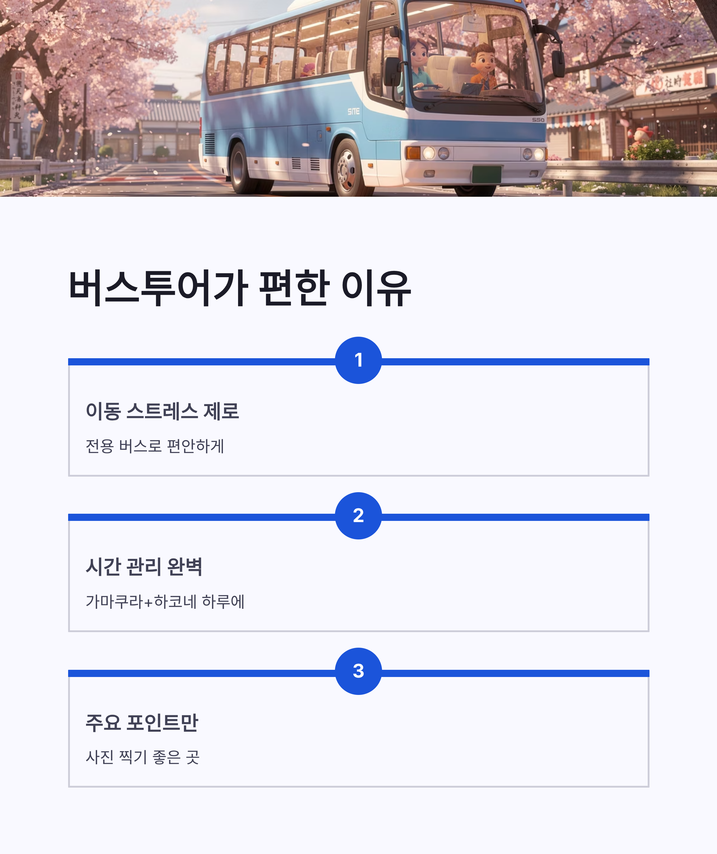 | 구분 | 내용 | 체크 포인트 | | -- | ----- | ------------- | | 출발 | 도쿄 시내 | 아침 출발 여부 중요 | | 이동 | 전용 버스 | 체력 소모 적음 | | 포함 | 에노덴 | 포함 안 되면 동선 꼬임 | | 귀환 | 저녁 도쿄 | 숙소 복귀 편함 |