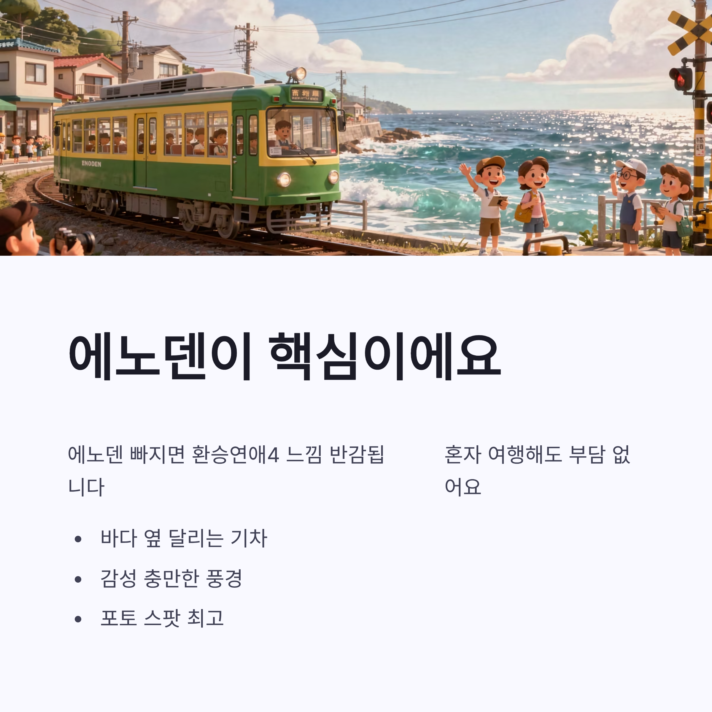 제가 느낀 건, 에노덴 포함 여부가 진짜 중요했어요. 이게 빠지면 환승연애4 느낌이 반감됨니다…ㅠㅠ 혼자 여행하시는 분들도 버스투어면 부담 덜하겠더라구요.