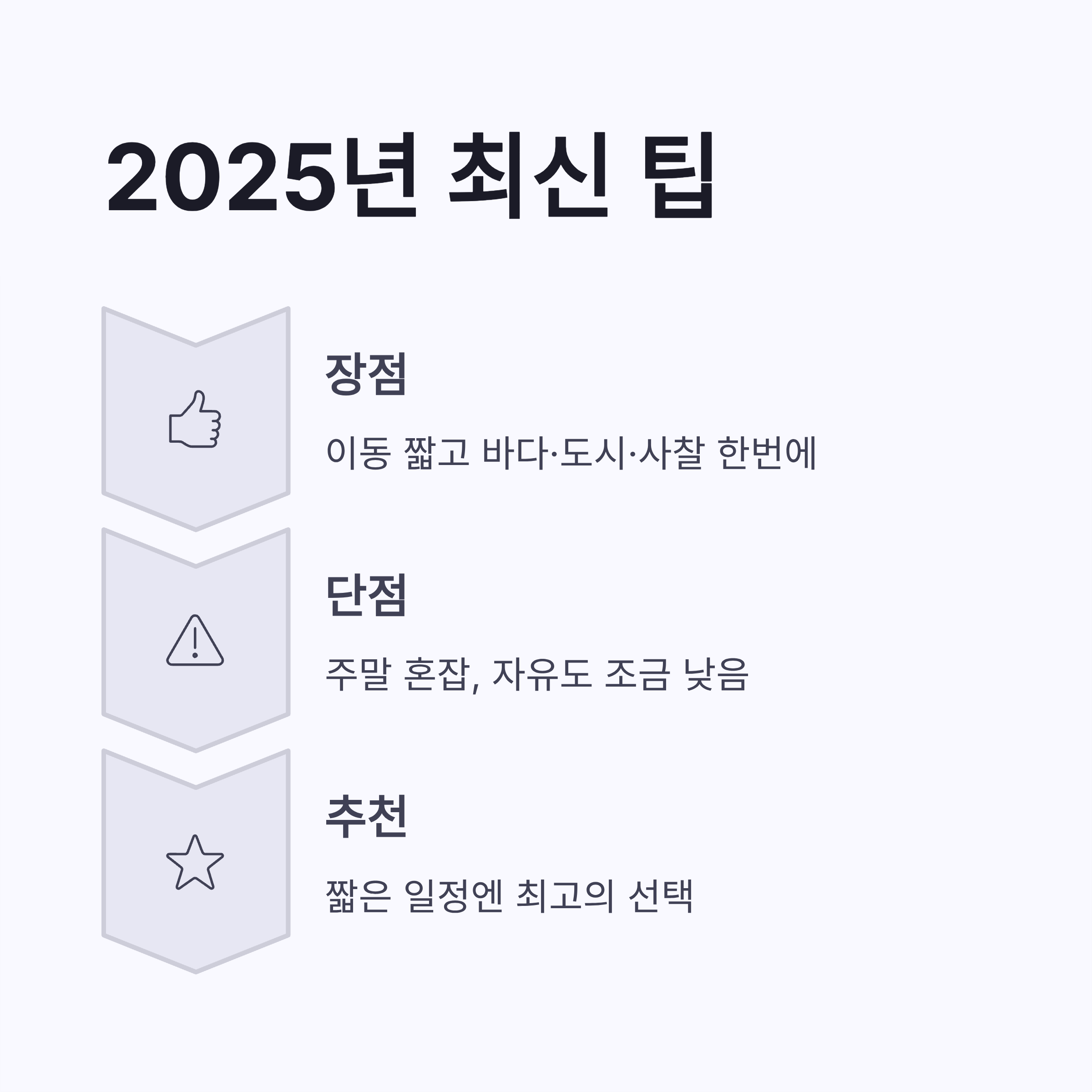 장점은 이동이 짧고, 바다·도시·사찰 분위기를 한 번에 느낄 수 있다는 점! 단점은 주말엔 혼잡하고, 자유도가 조금 떨어진다는 거였어요. 그래도 짧은 일정엔 이만한 선택이 없더라구요. 하코네까지 묶으면 온천 지역 풍경도 같이 볼 수 있어서 만족도는 확실히 올라가요.