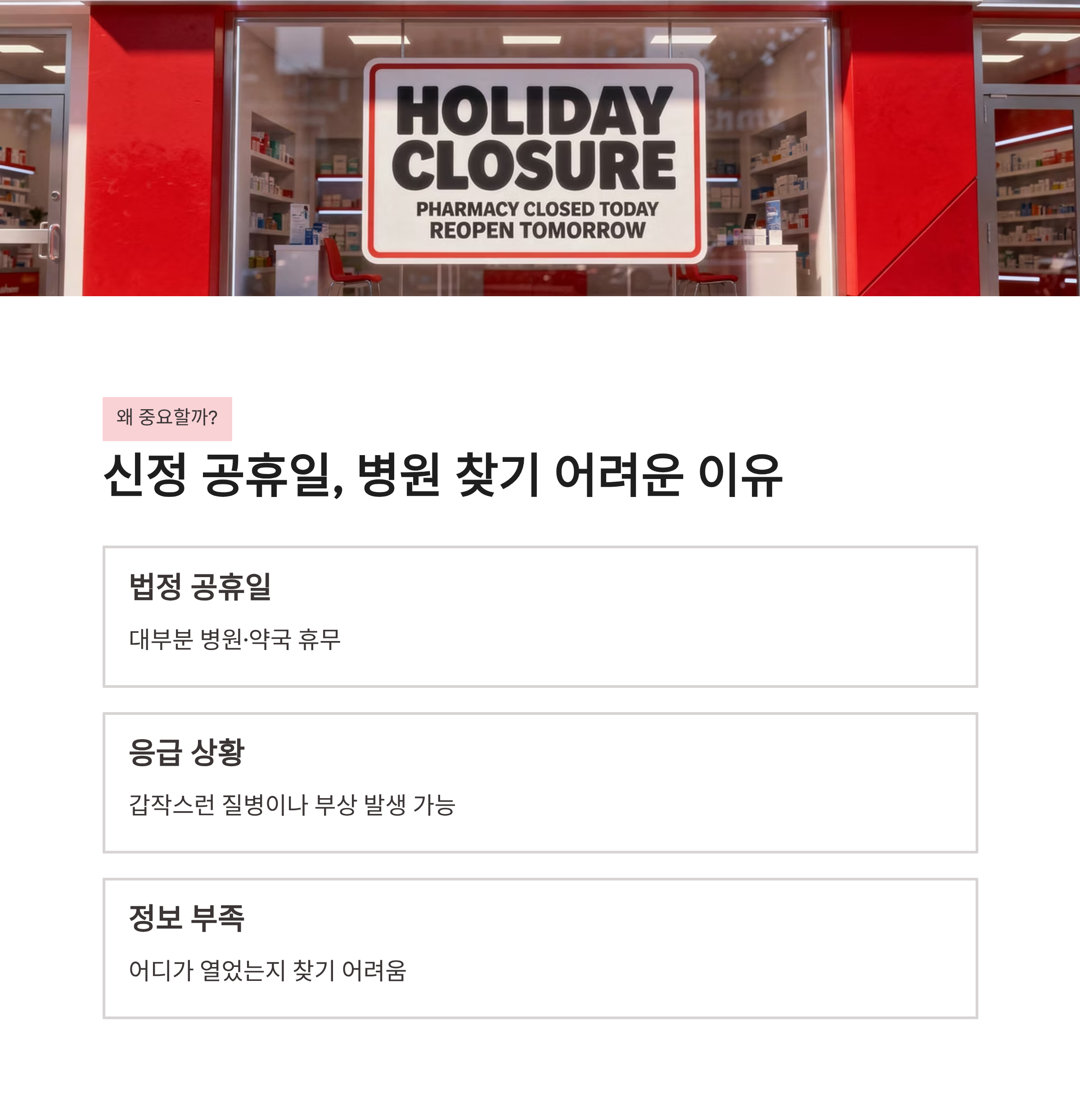 | 약국 | 공휴일 약국 검색 | 오전만 운영하는 곳 많음 |