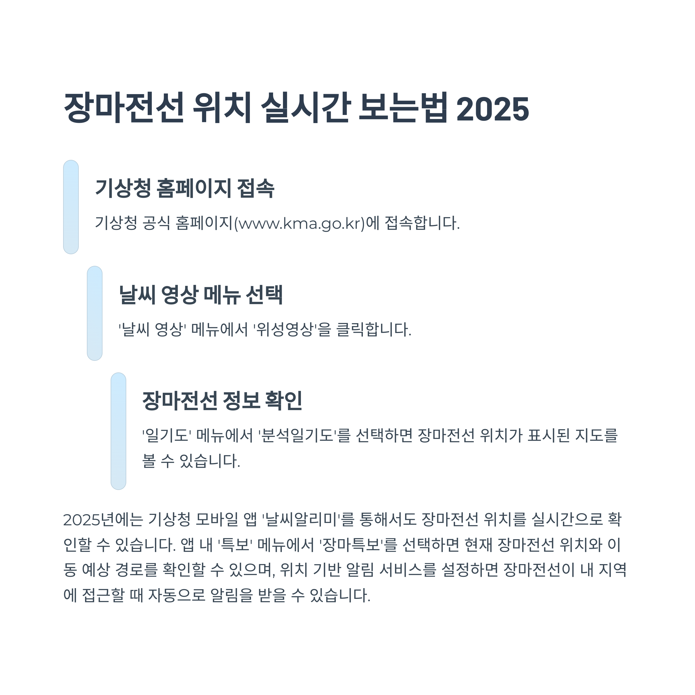 장마전선 위치를 실시간으로 파악하면, 어느 지역에 비가 집중될지, 언제 이동할지 미리 예측할 수 있어서 출퇴근, 외출 준비에 큰 도움이 돼요!