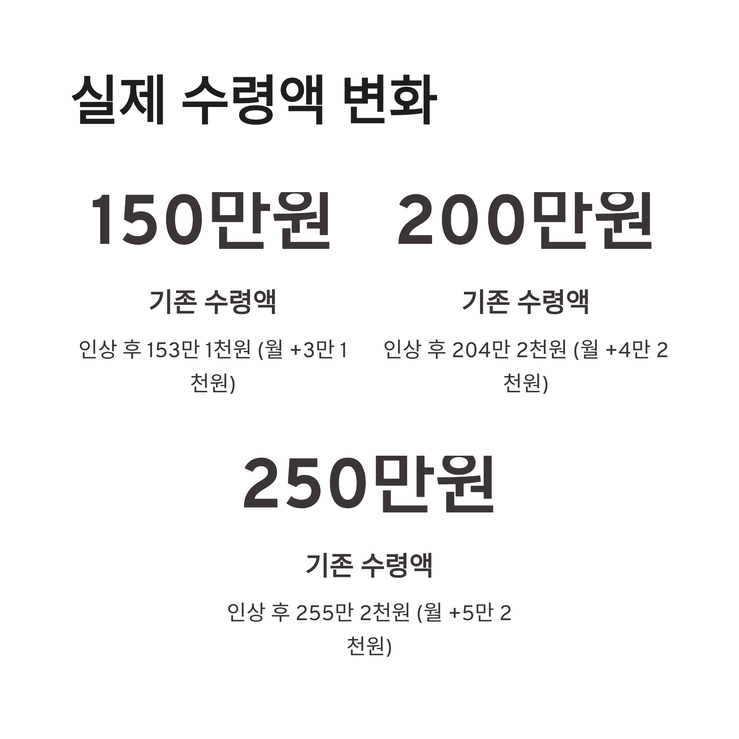 | 기존 월 수령액 | 인상률 | 인상 후 월 수령액 | 월 증가액 |