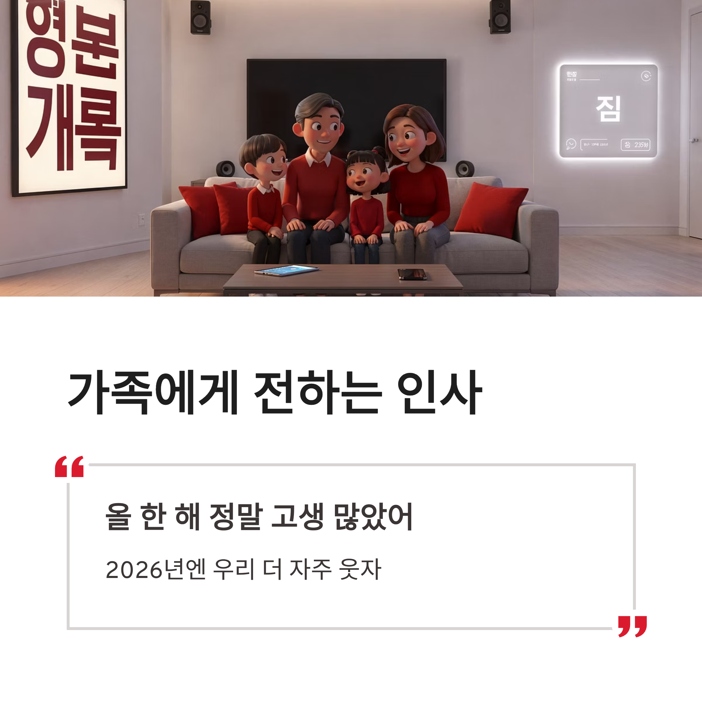 | 가족 | 올 한 해 정말 고생 많았어. 2026년엔 우리 더 자주 웃자 |