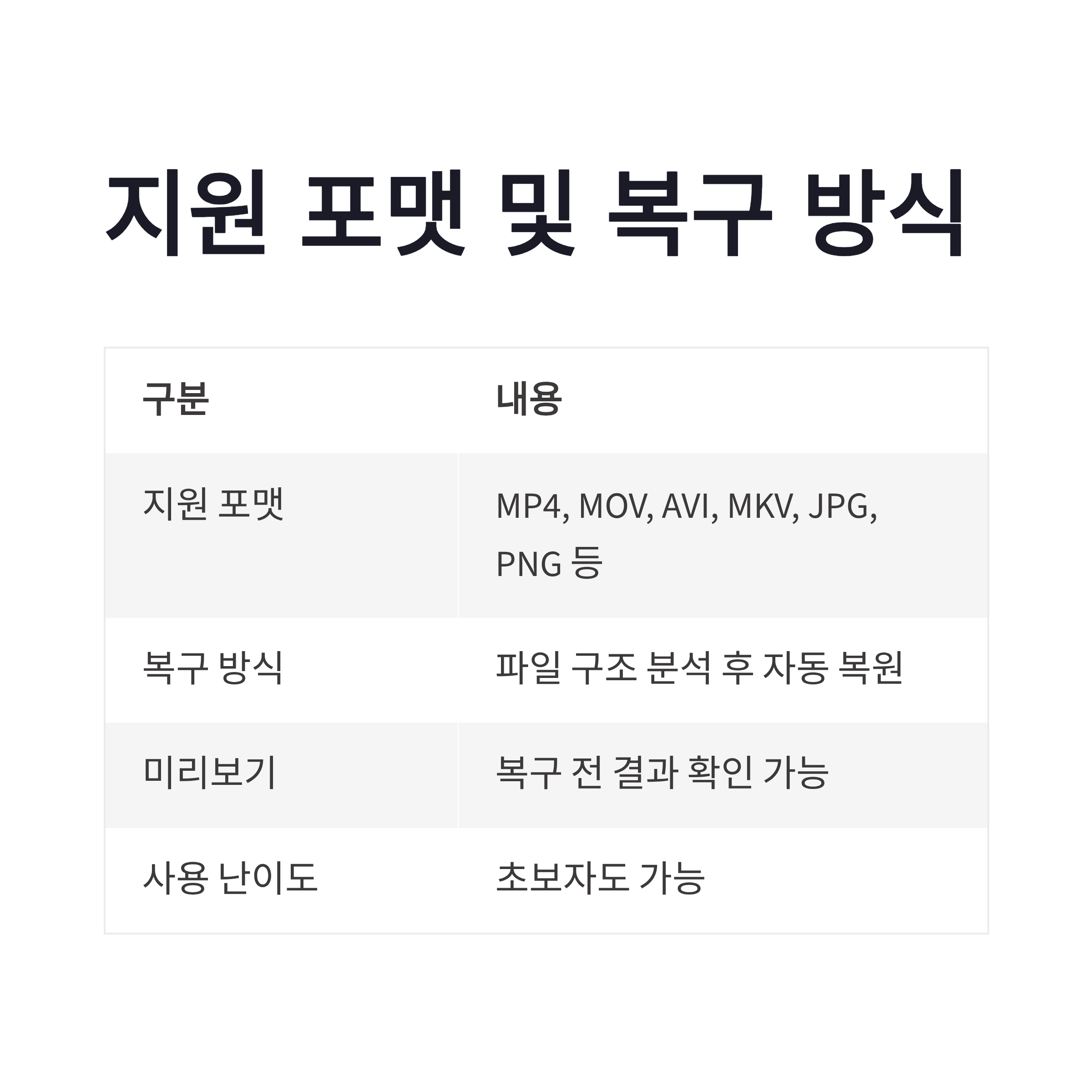 | 복구 방식 | 파일 구조 분석 후 자동 복원 |