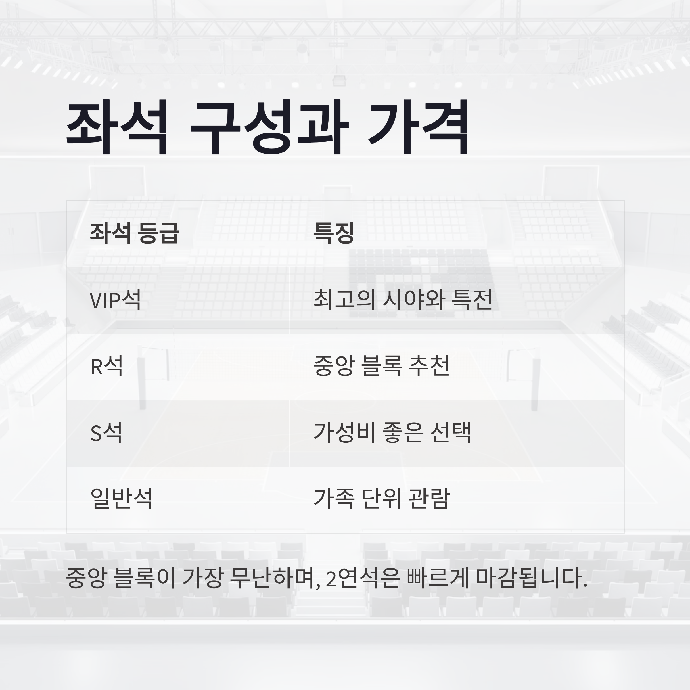 | 좌석 구성 | VIP / R석 / S석 / 일반석 |